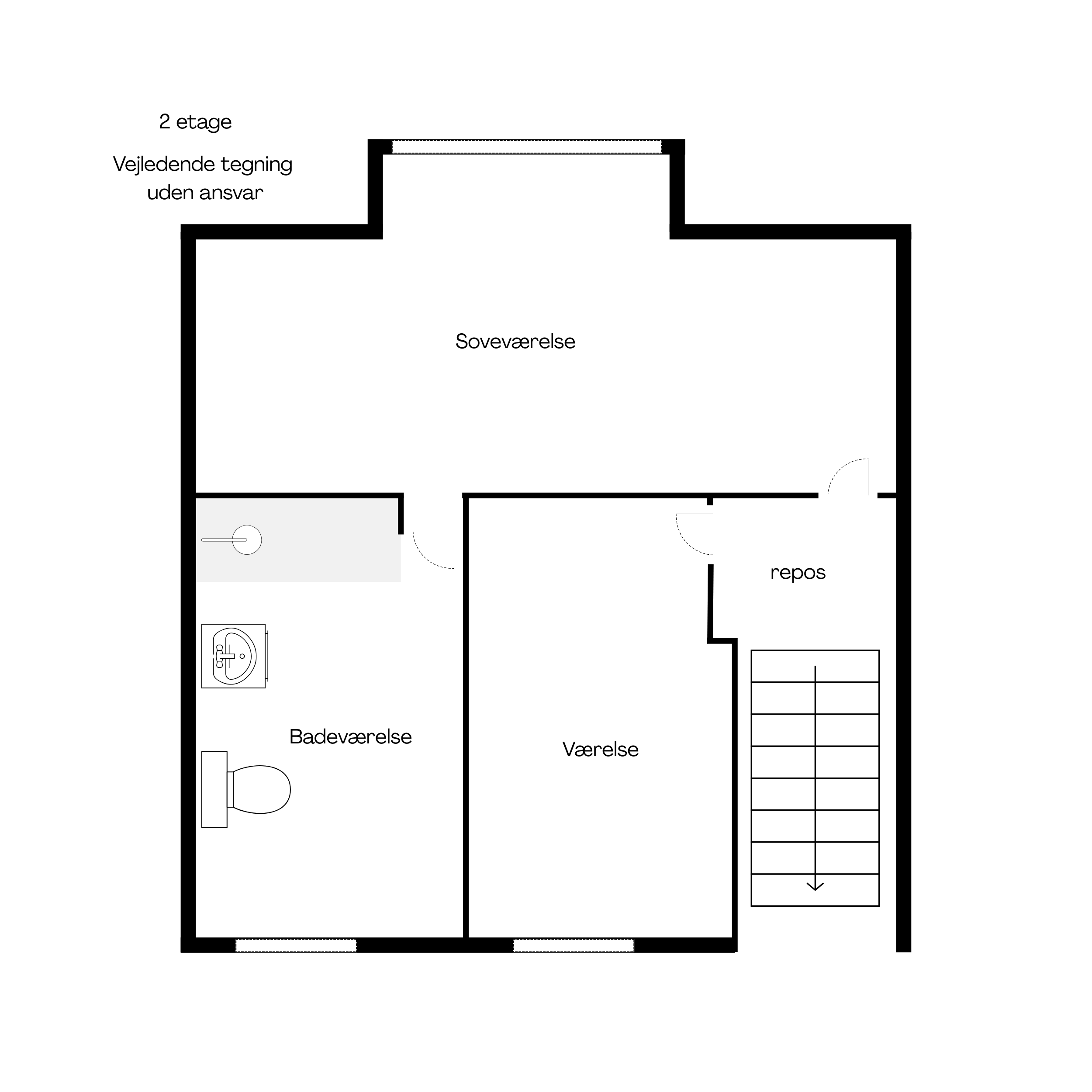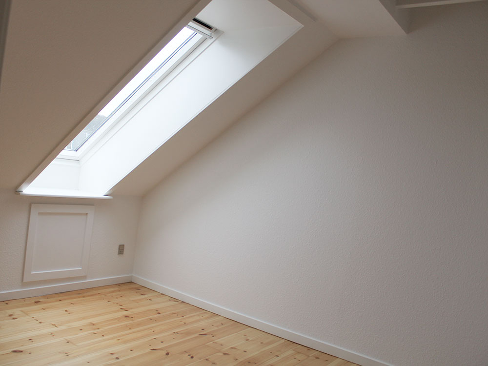 På øverste etage finder du et børneværelse og et stort soveværelse med dejlig lysindfald fra kvisten. Videre ind gennem soveværelset finder man et rummeligt badeværelse med mulighed for at installere vaskemaskine og kondenstørretumbler.