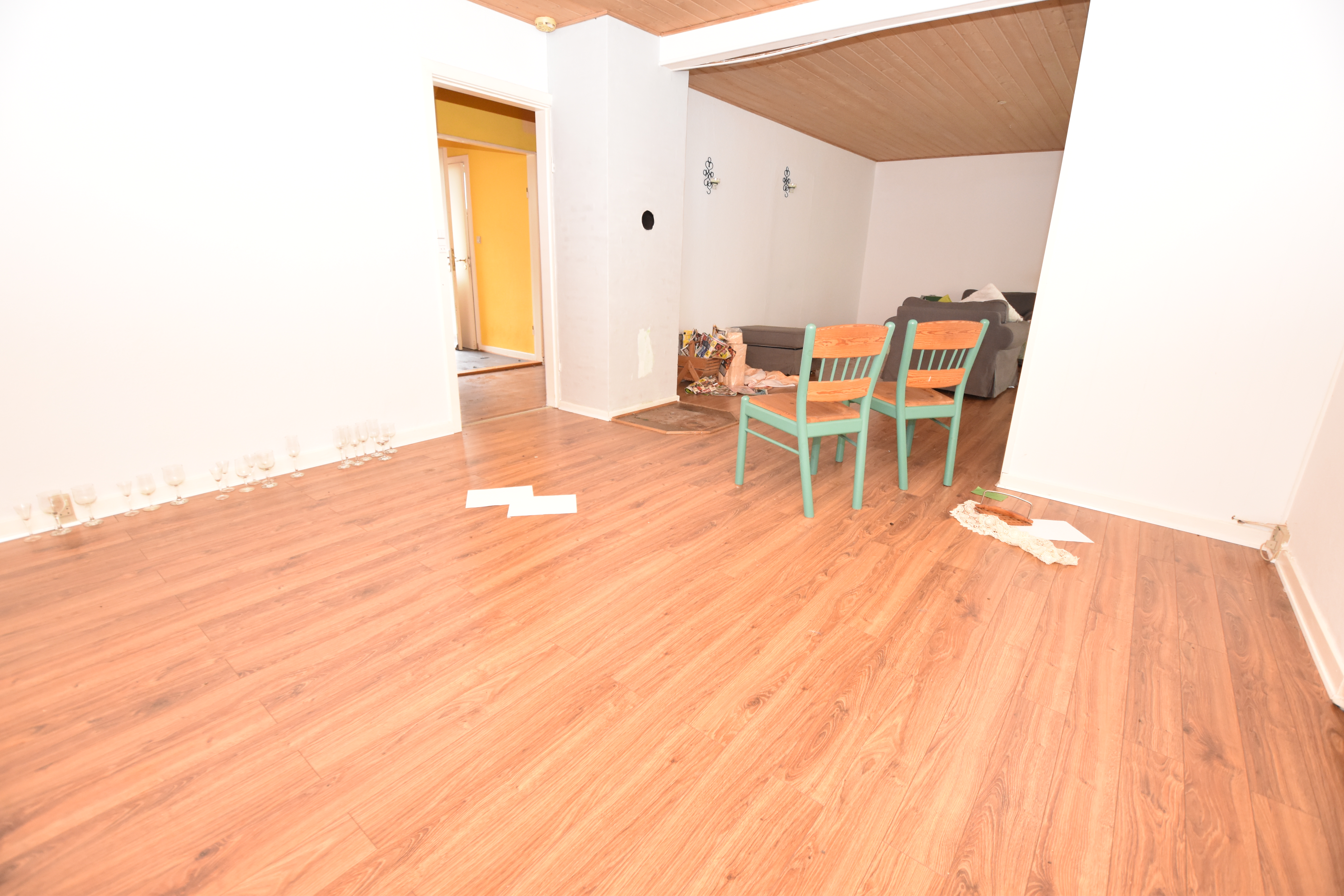 På husets 1. sal er der 4 værelser, hvor af et af værelserne er meget stort.