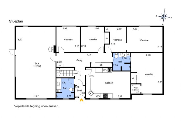 Lejlighed i stueplan: 6 værelses lejlighed på 179 m2 + ca. 25 m2 underetage. Lejligheden består af: Entre. Mellemgang med skabsvæg. Stort køkken med spiseplads, elementer i eg, keramisk kogeplade, køle/fryseskab og opvaskemaskine. Badeværelse med lyse fliser fra loft til gulv, bruseniche og lyst skabsarrangement med indbygget vask. Stor lys stue med brændeovn og udgang til have. 5 værelser, heraf et stort soveværelse med eget badeværelse med bruseniche. Nedgang til underetage, med vaskerum/fyrrum, værelse/magasinrum og udgang.