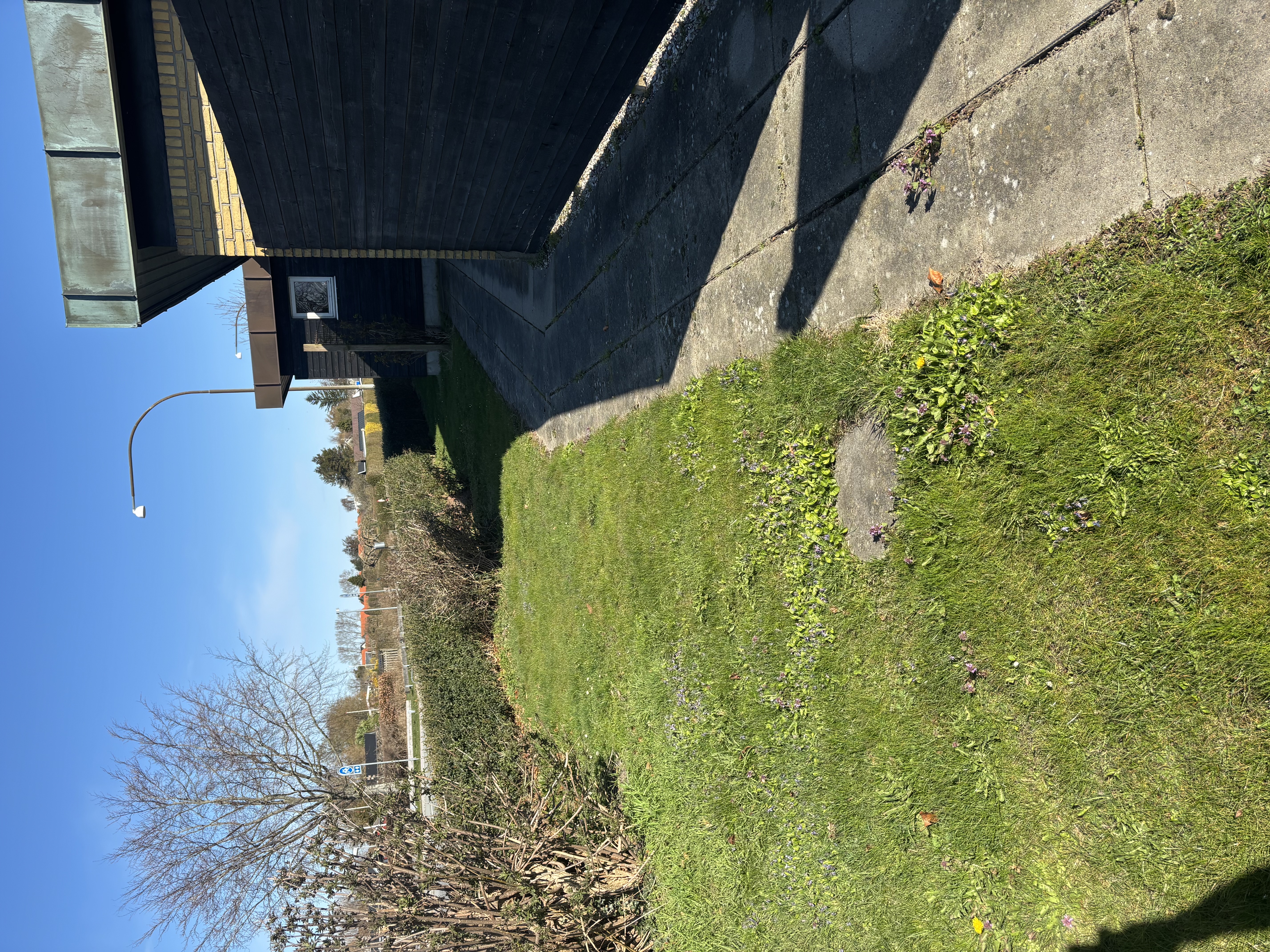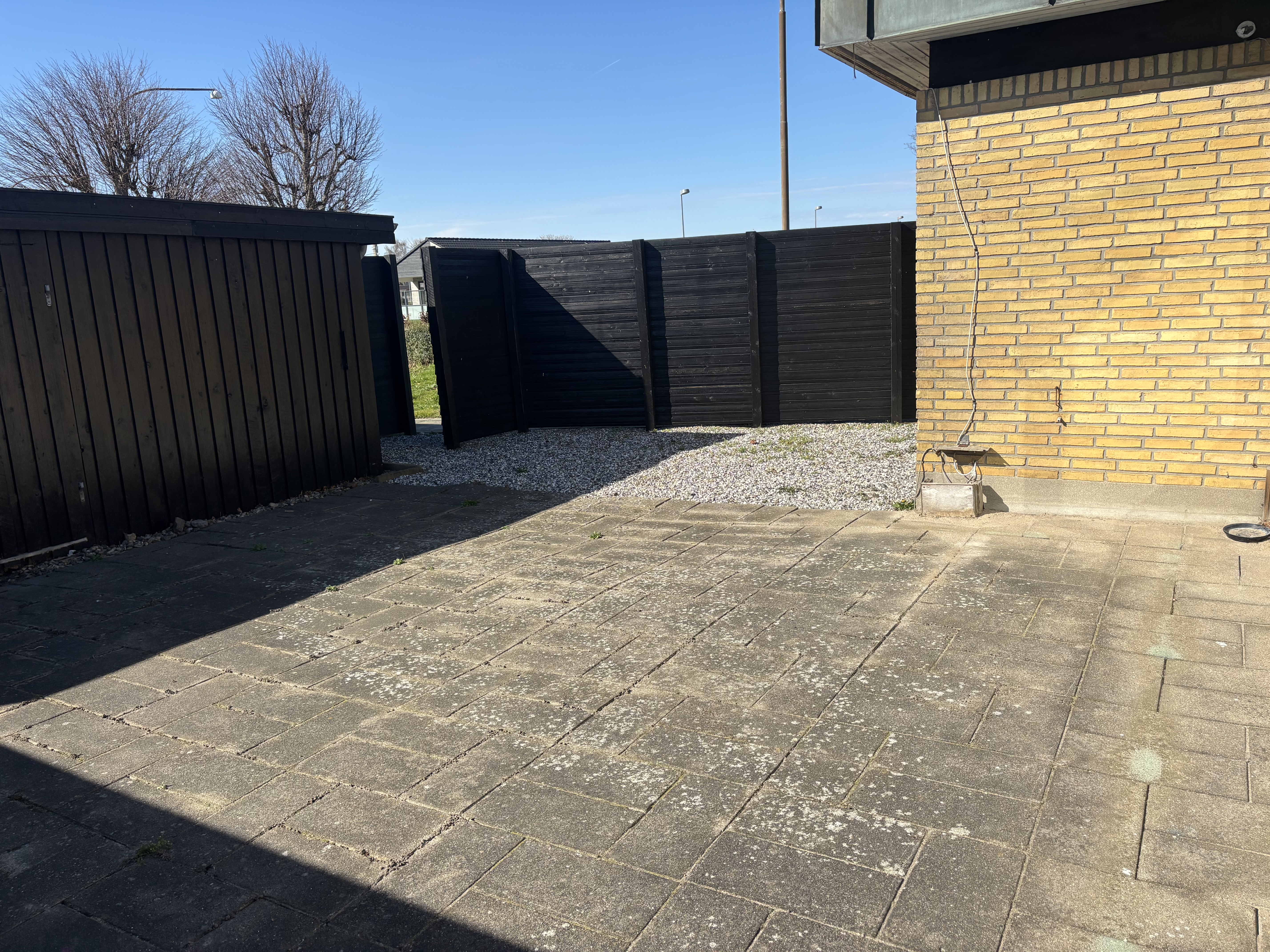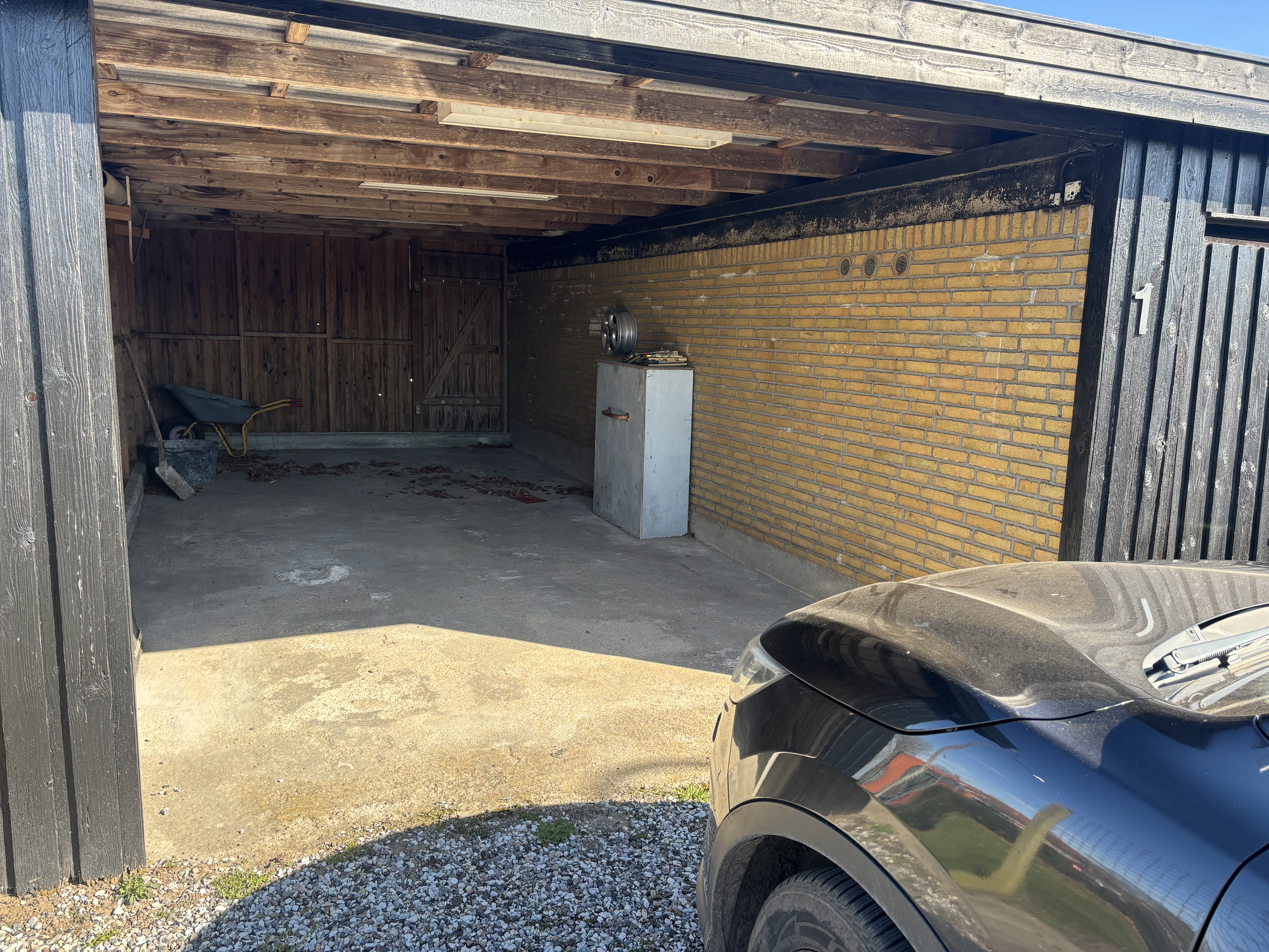 Carport og garage. Lukket terrasse samt overdækket terrasse. Overkommelig have anlagt med græs.