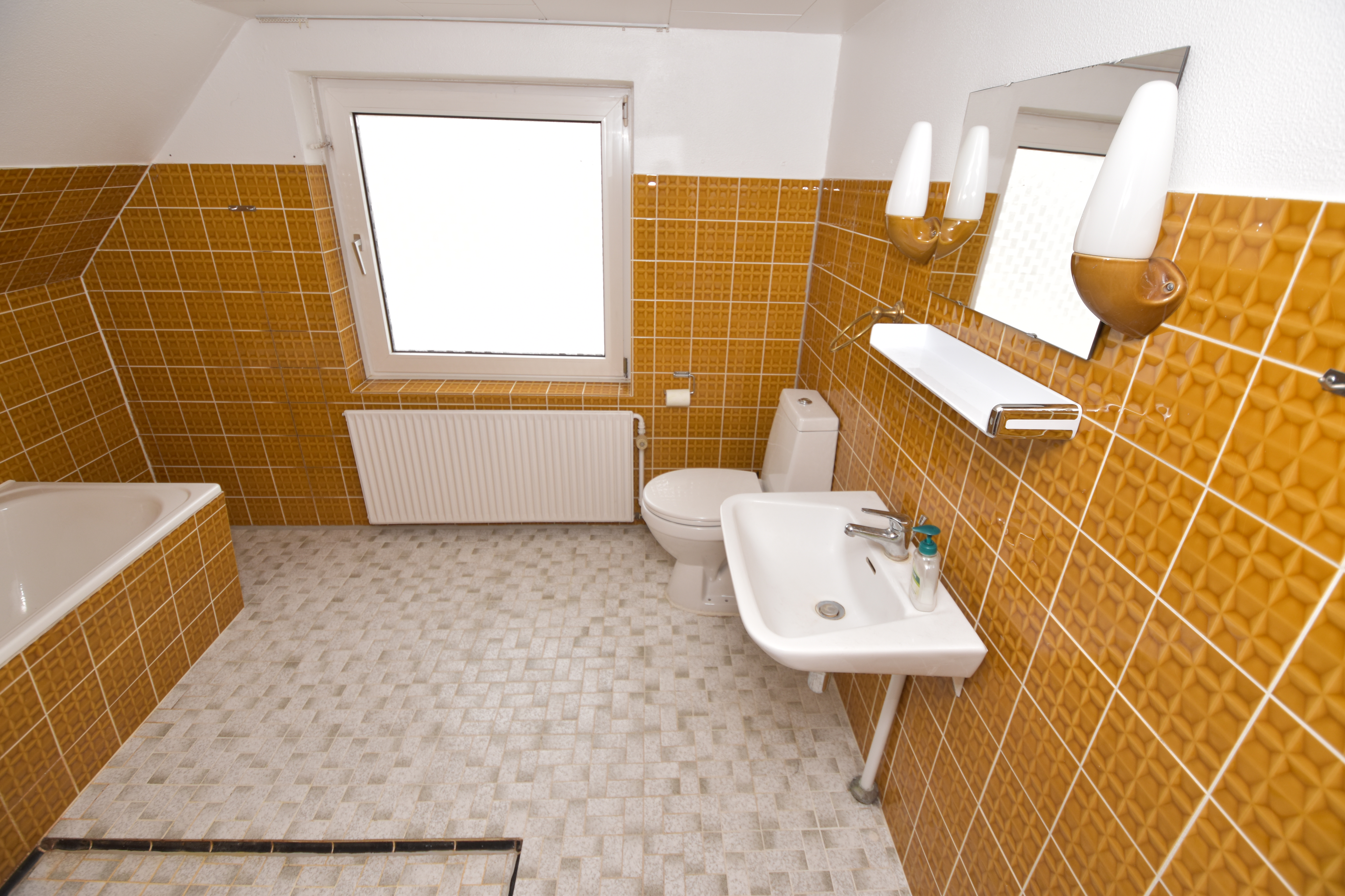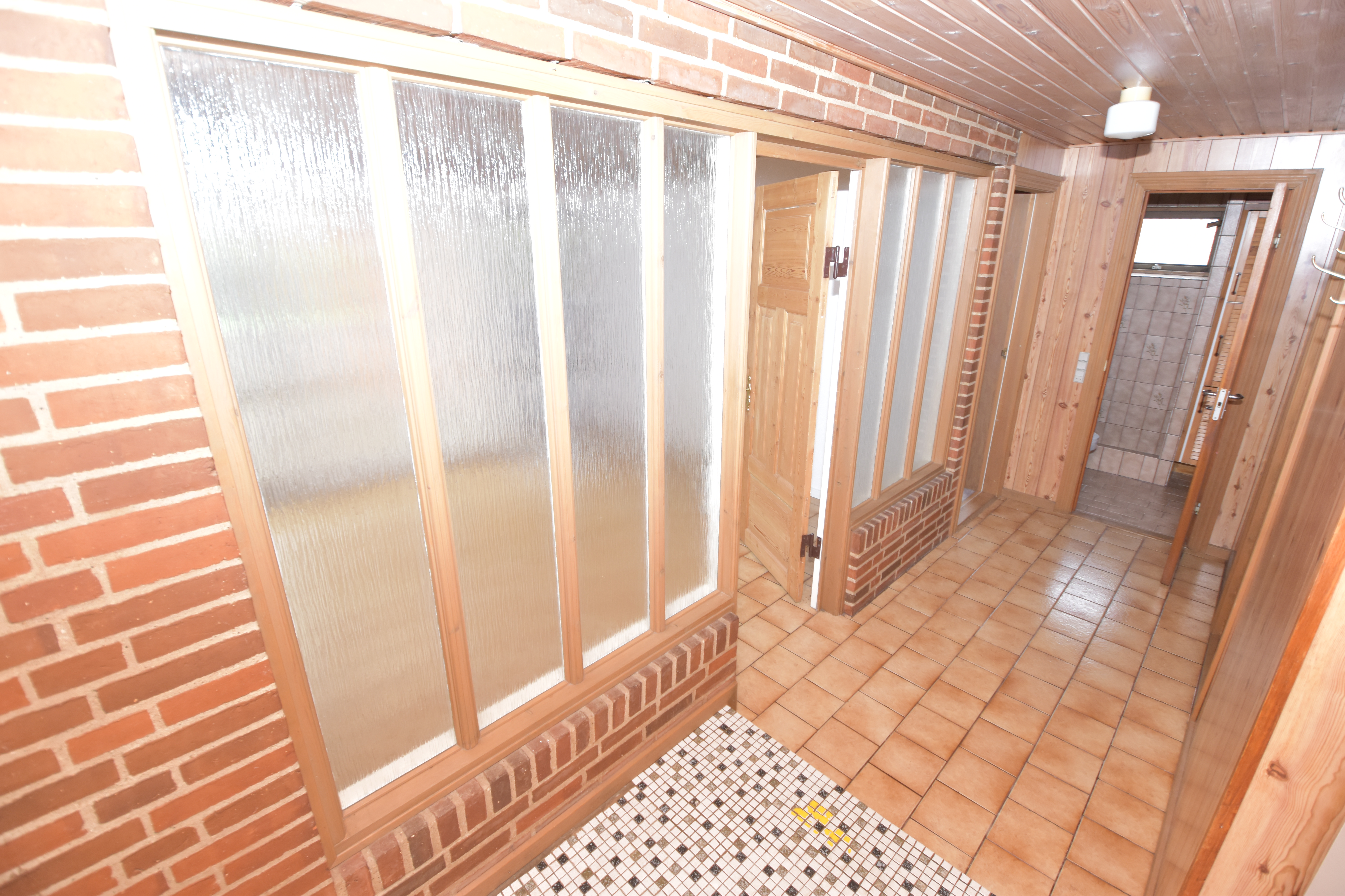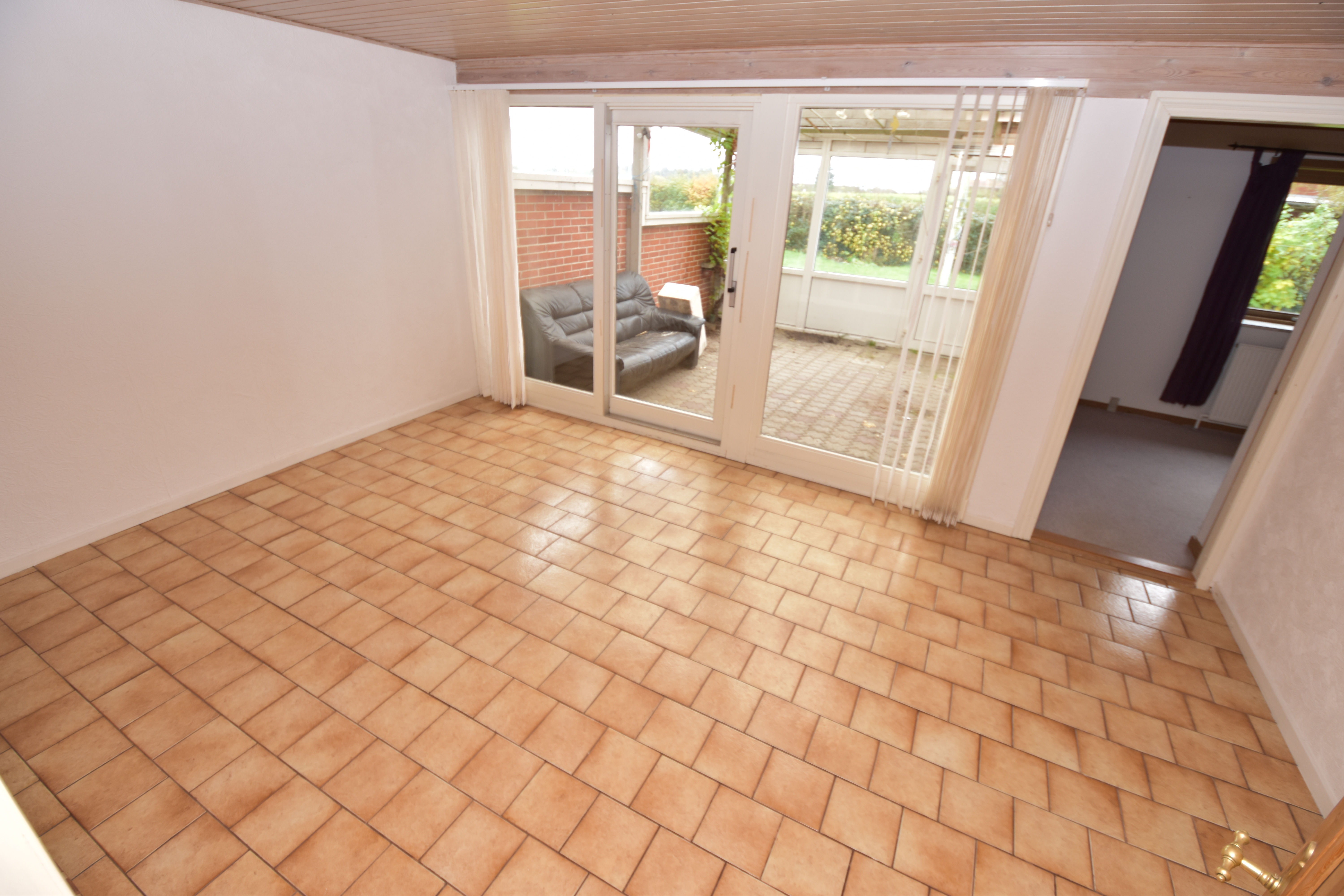 Der er adgang til en flisebelagt udestue. Værelserne er hovedsageligt med gulvtæpper.Der er også bad/toilet i stueplan.Brusenichen består ligesom resten af badeværelset af klinker på både gulv og vægge.