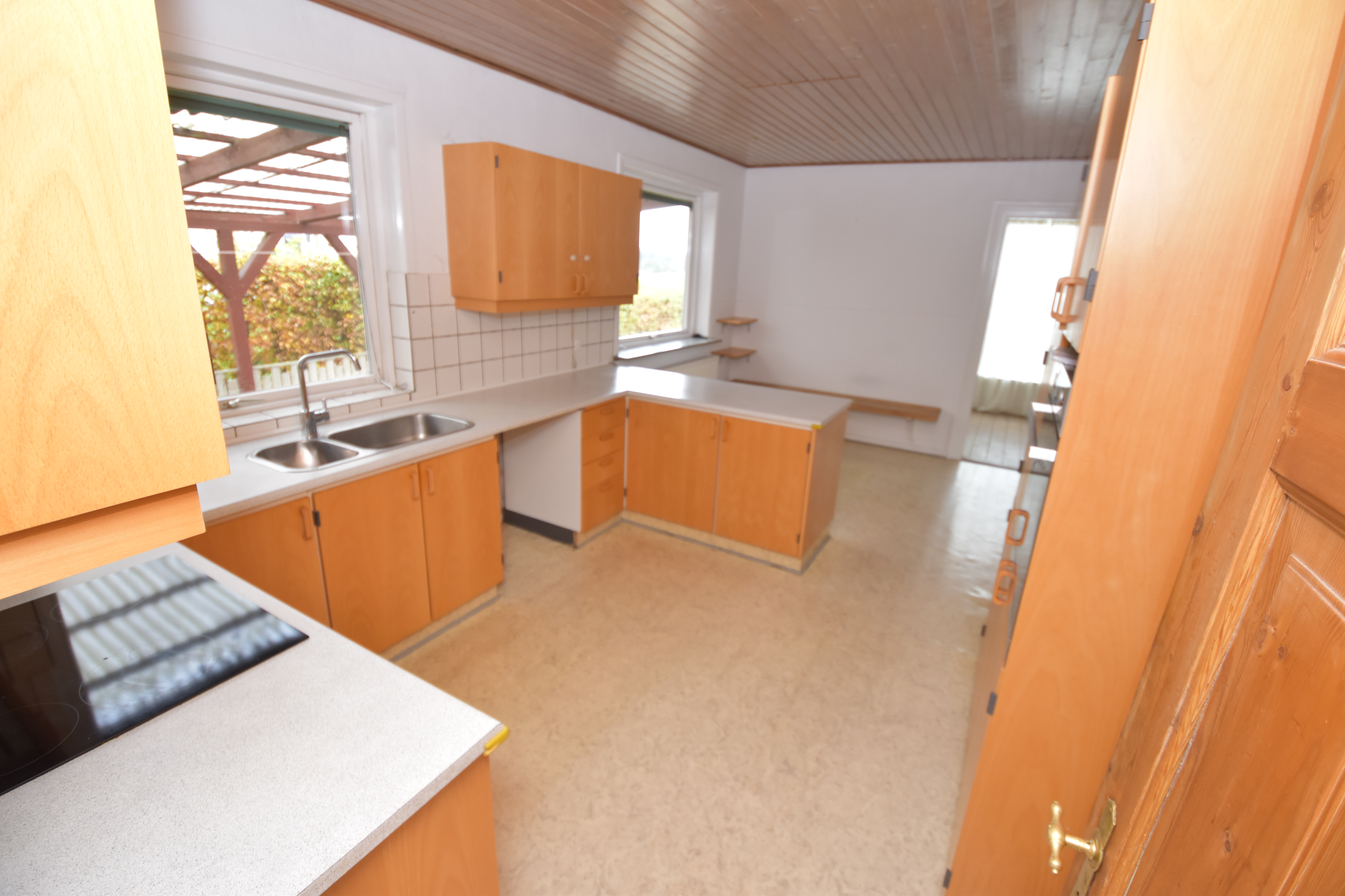 Køkkenet er med spisekrog.Derudover er der i køkkenet plads til en opvaskemaskine Fra køkkenet er der adgang til stuen, som har vinduer mod haven.