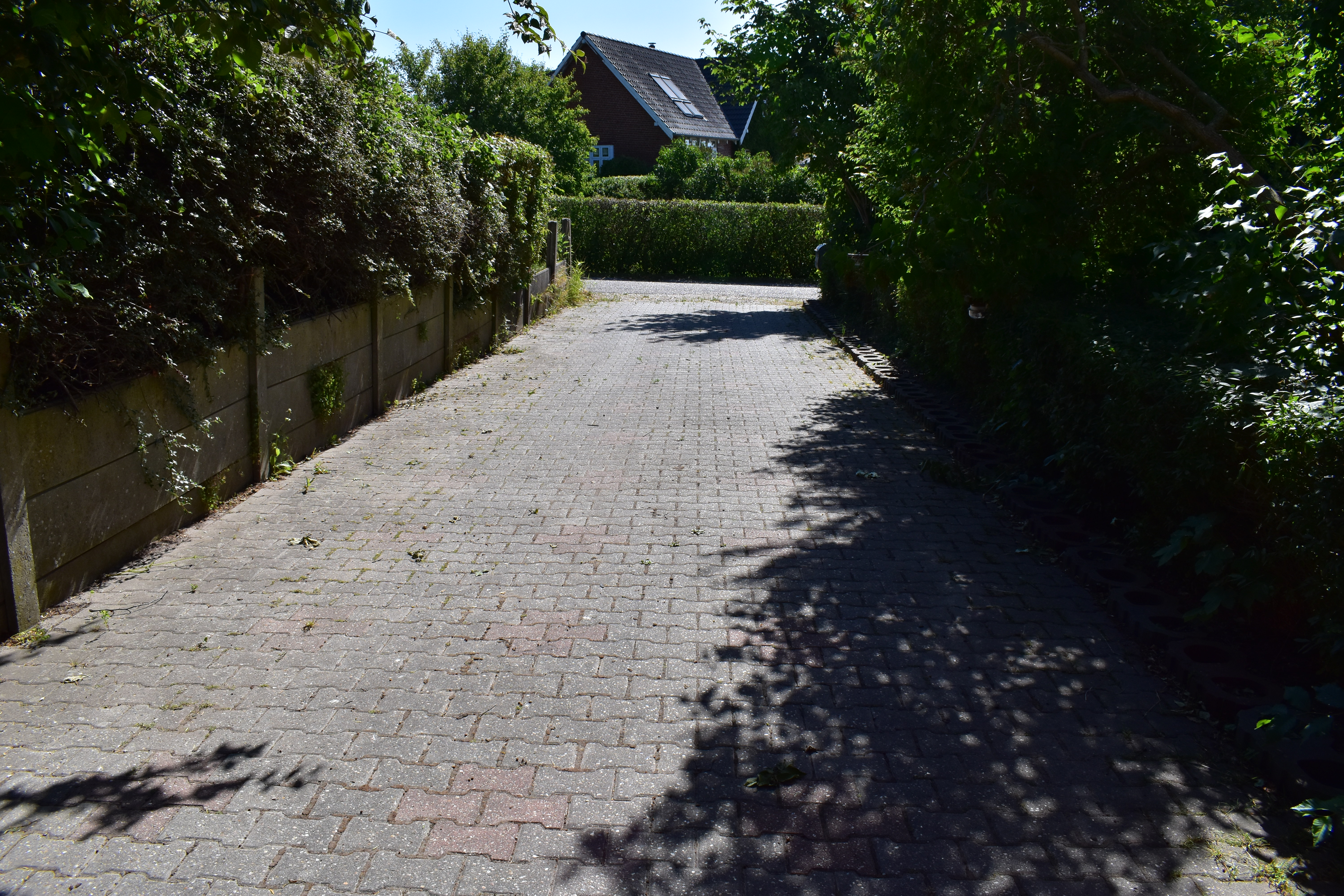 Foran huset er der en flisebelagt indkørsel op til carport og på hver side af huset er der have.