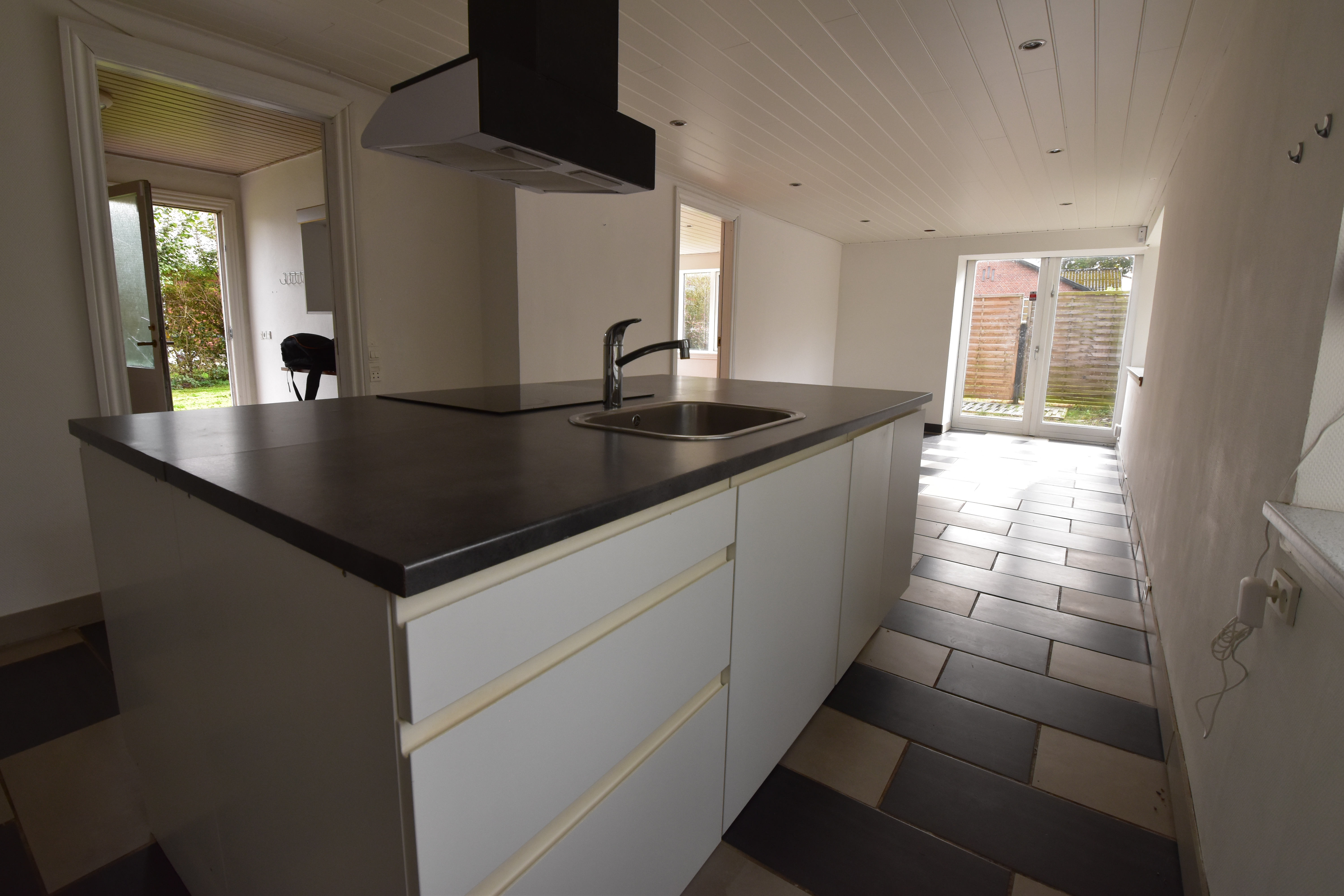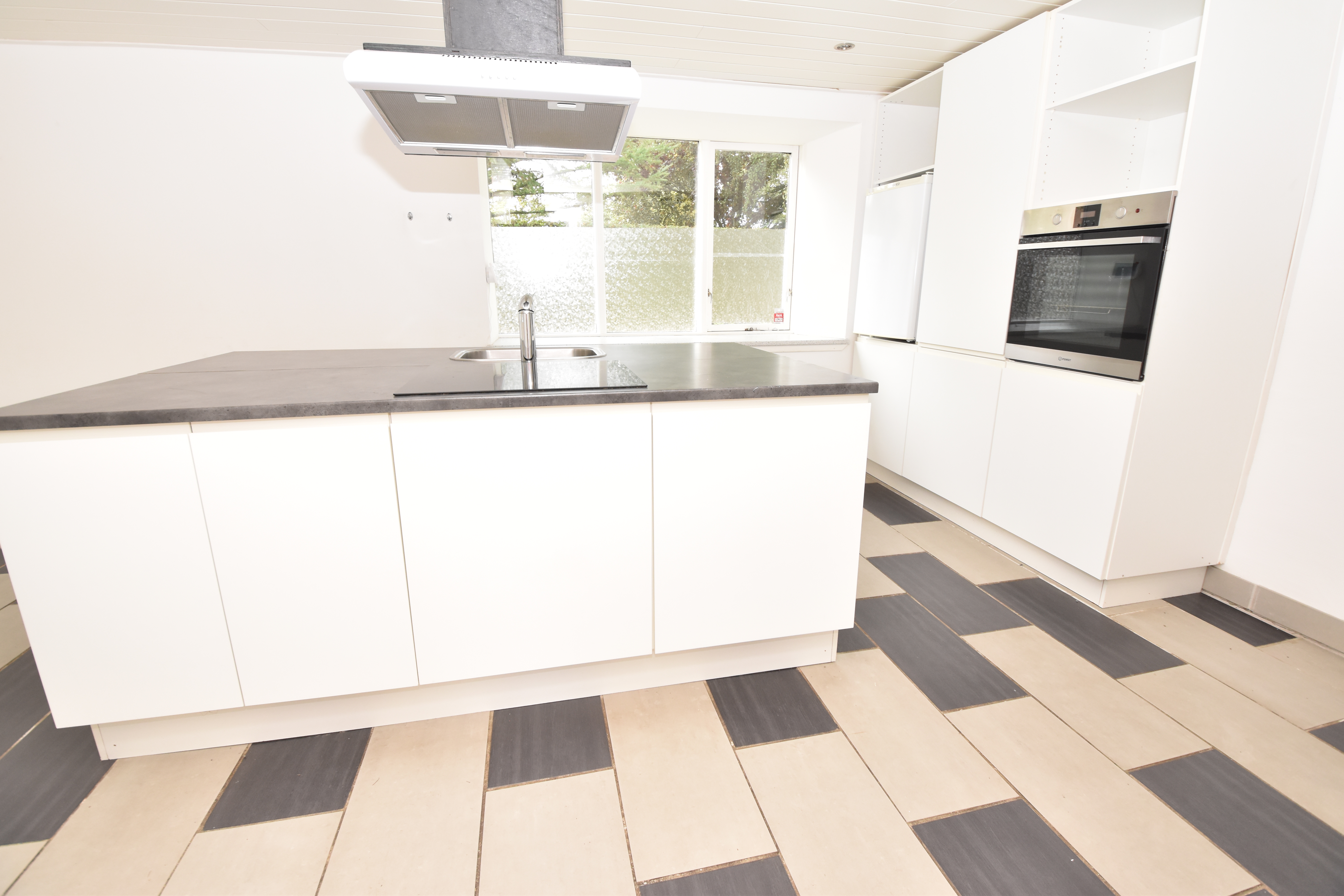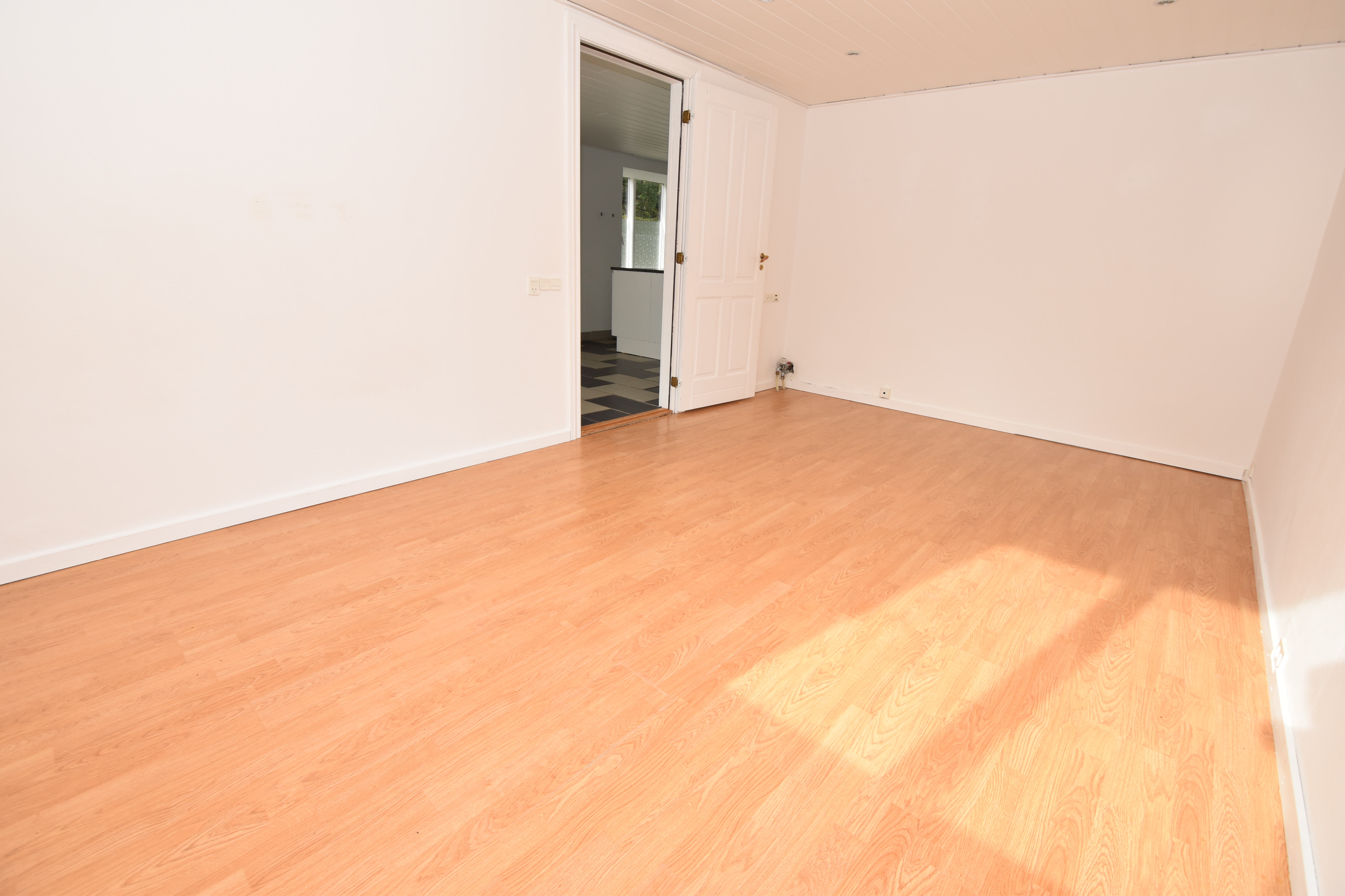 I stueplan er der værelse, badeværelse, køkken, soveværelse og en dejlig stor stue med stort vinduesparti - køkken all rum.