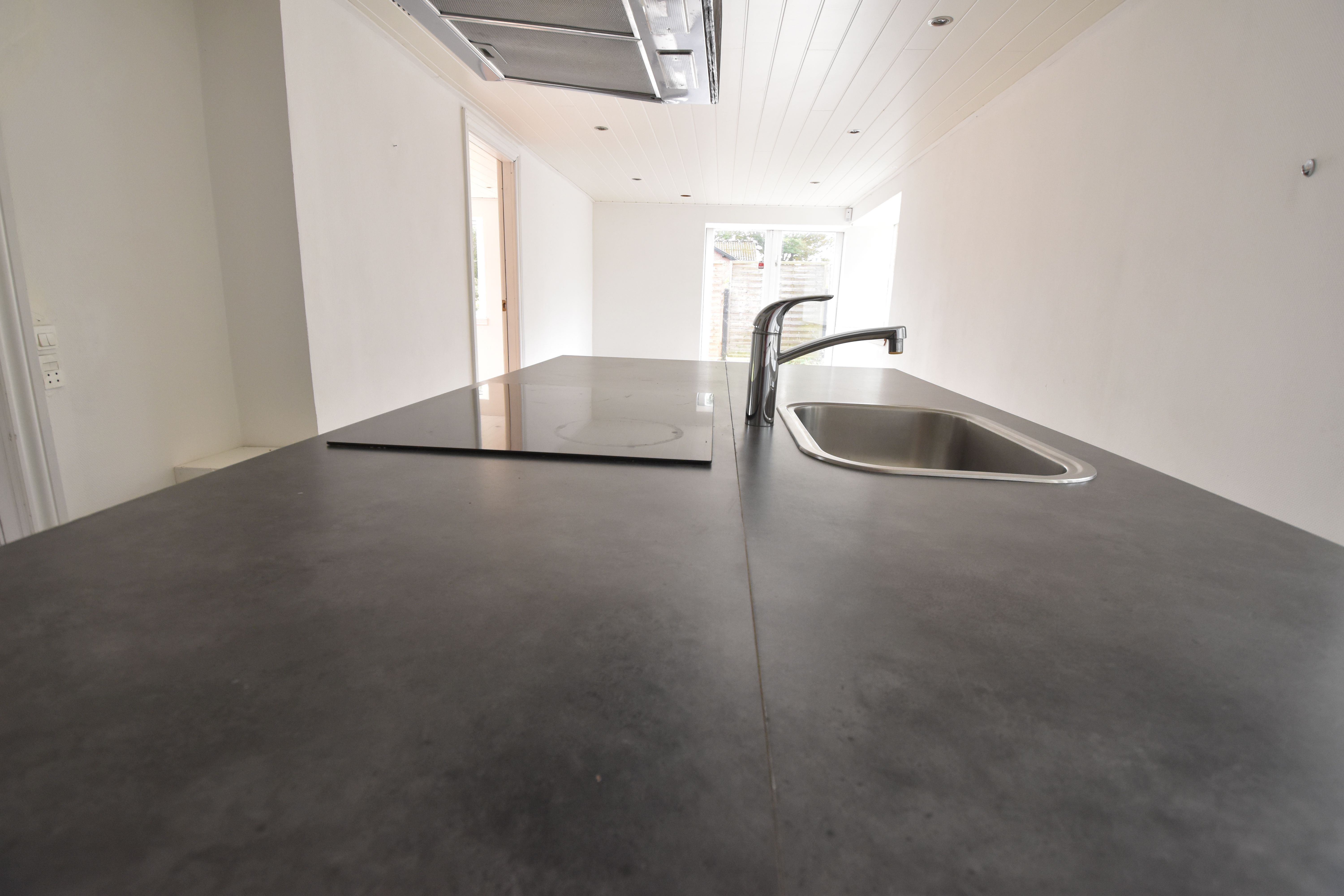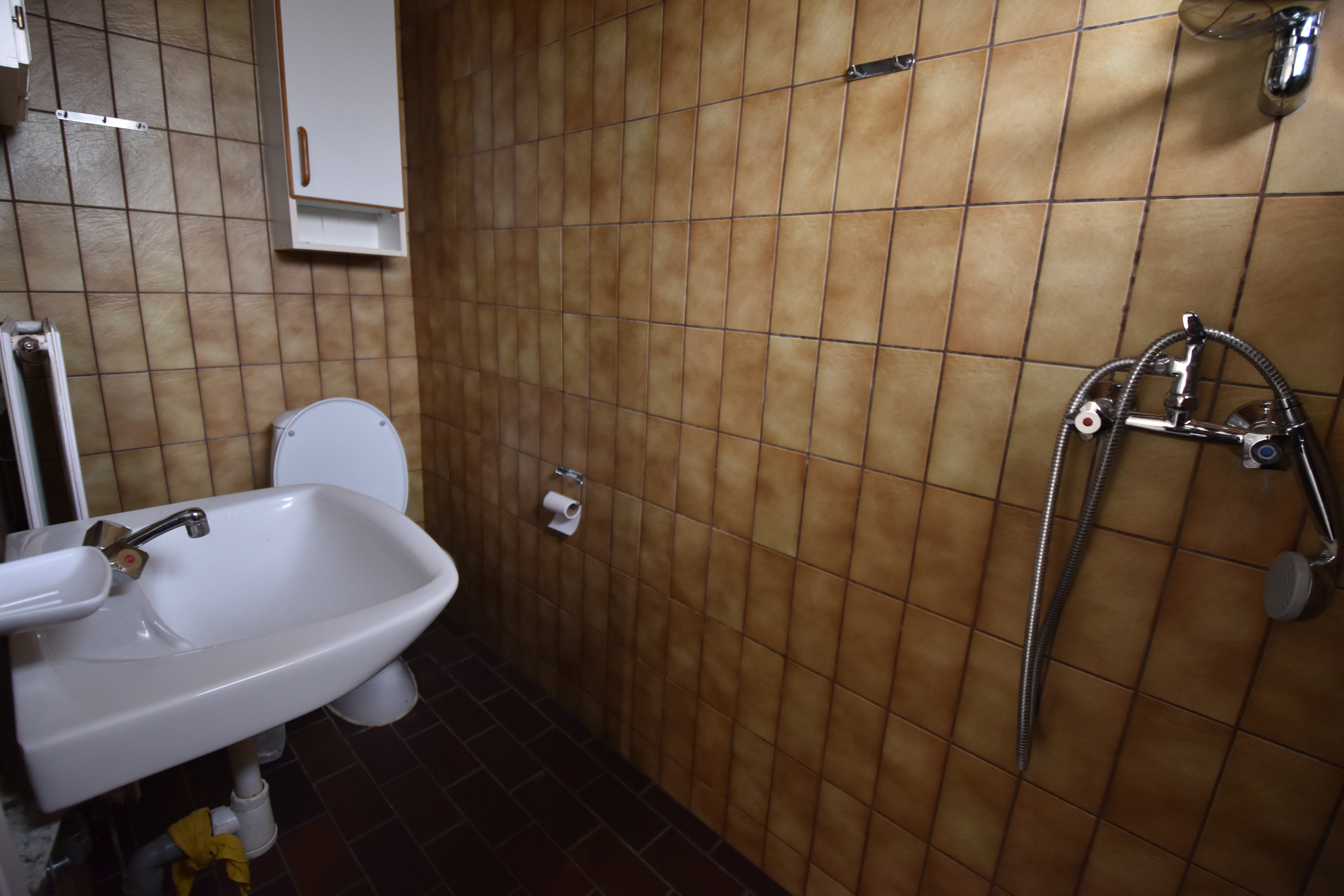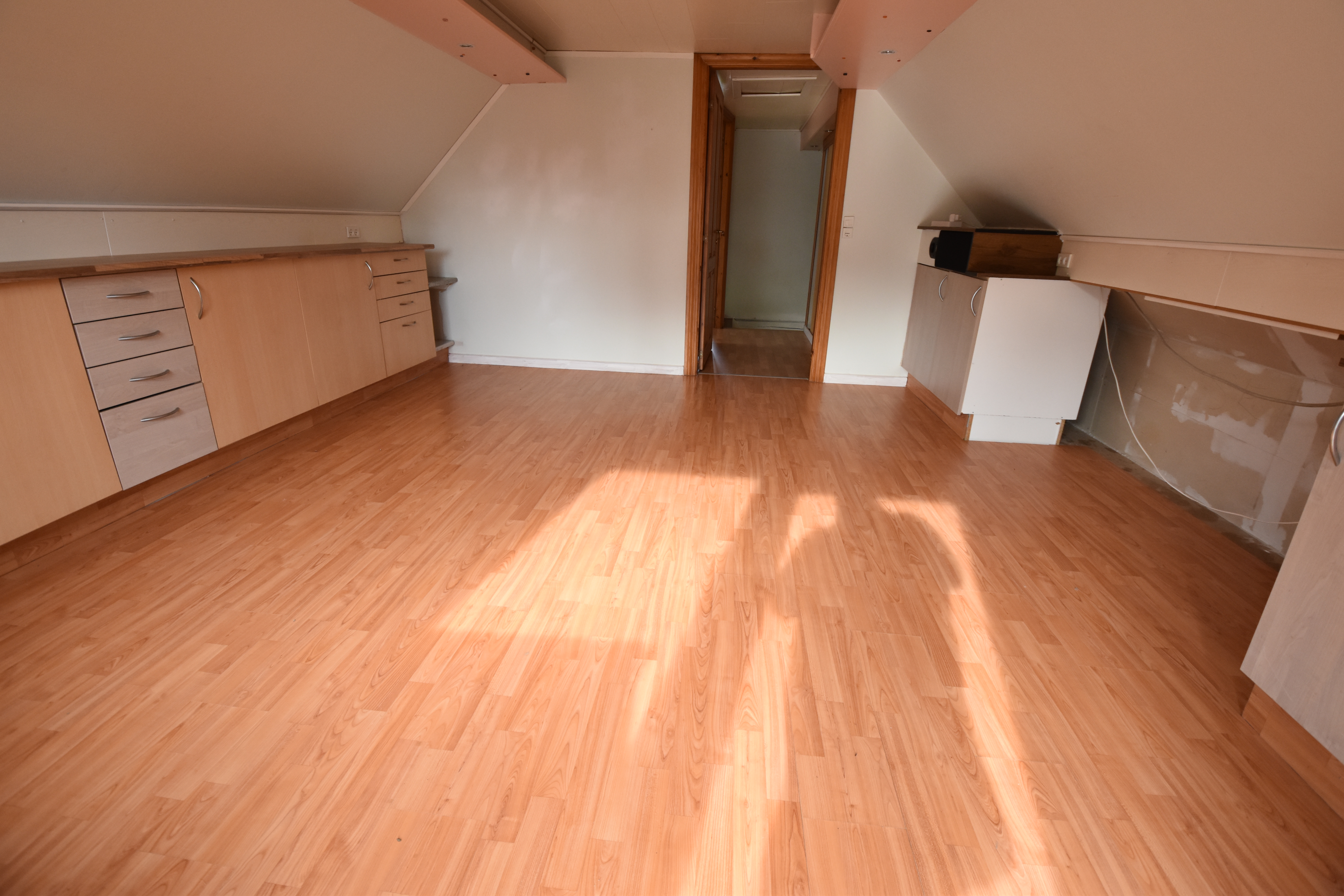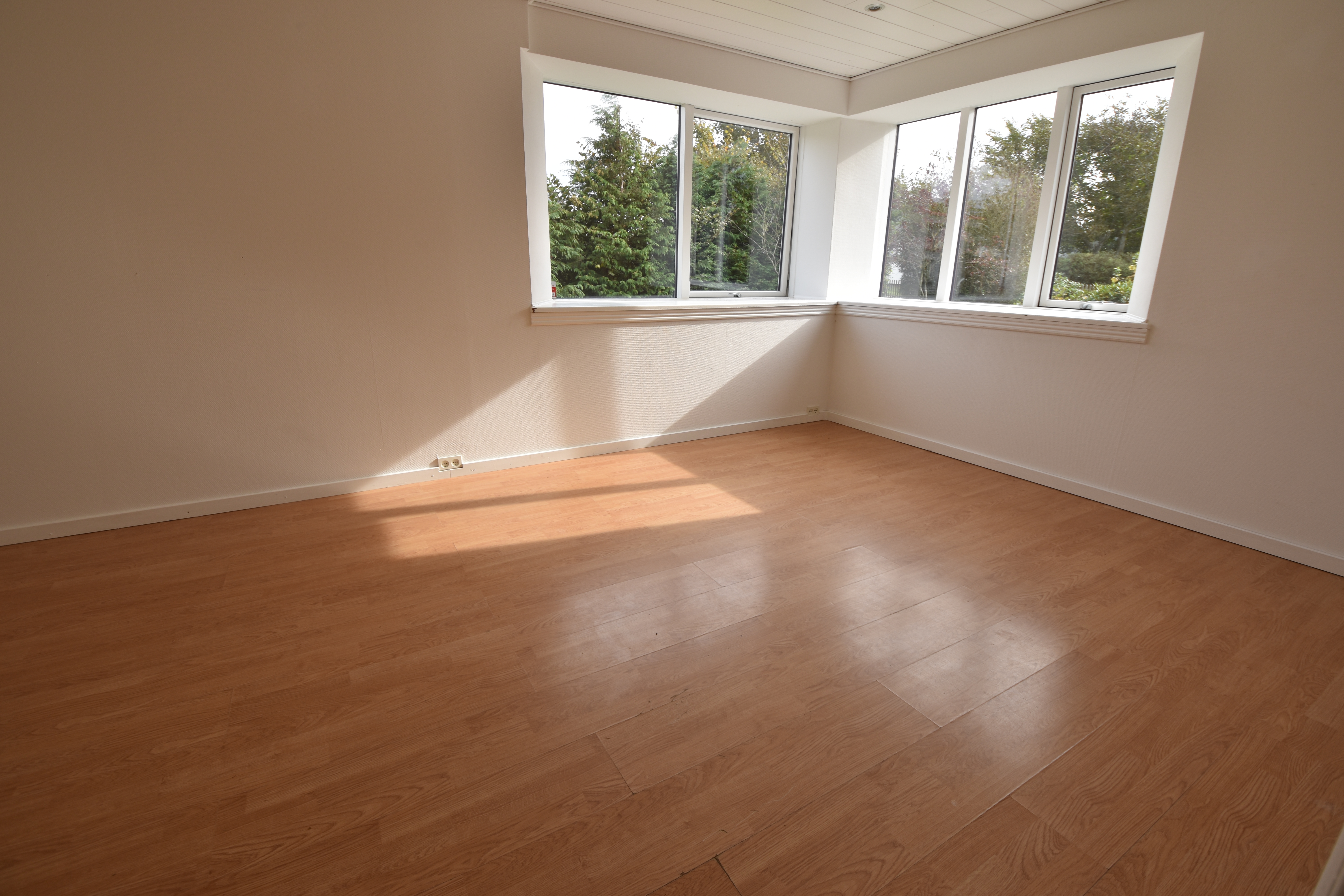 I stueplan er der værelse, badeværelse, køkken, soveværelse og en dejlig stor stue med stort vinduesparti - køkken all rum.
