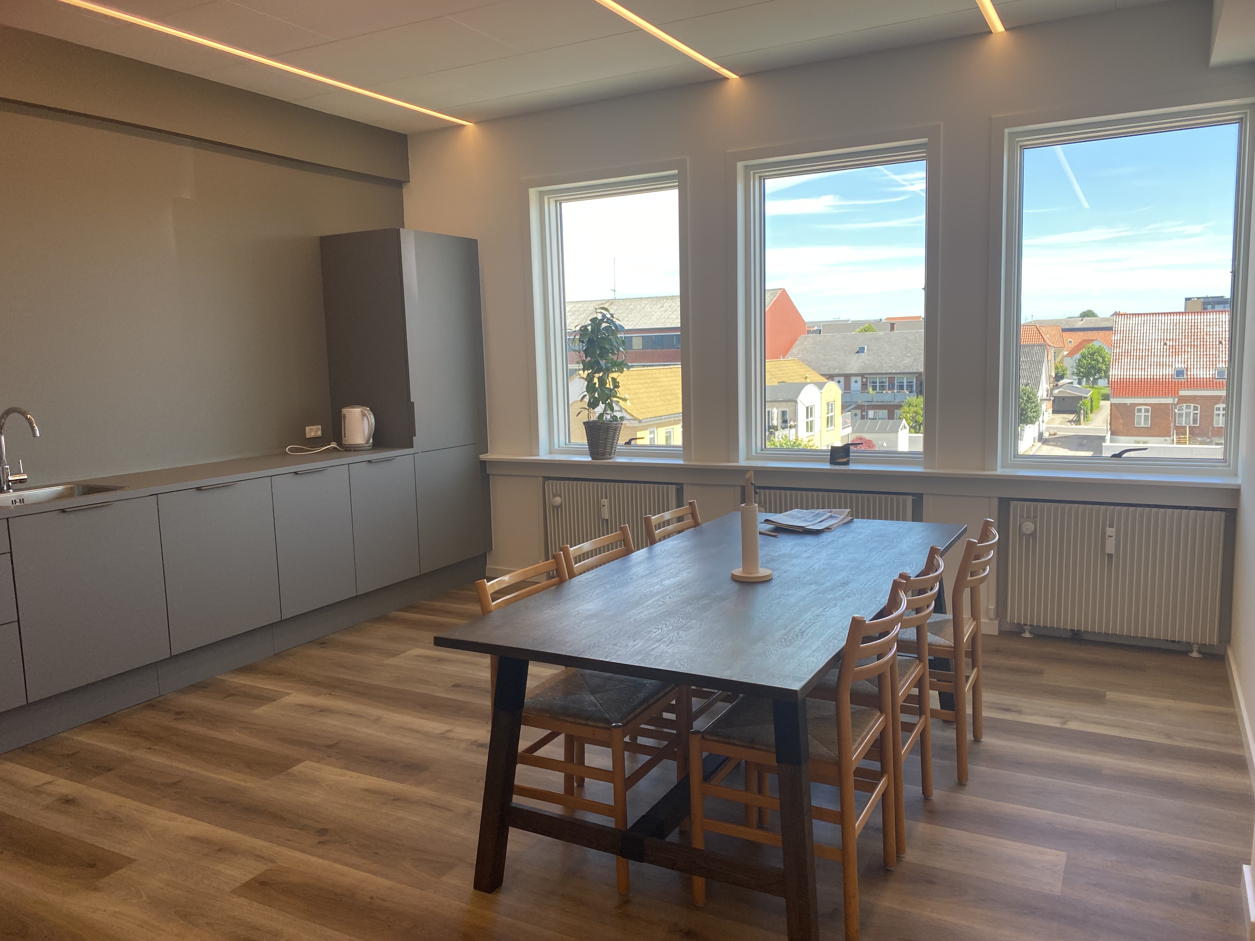 Lejemålene er indrettet med personalerum/køkken på 2. sal, som deles med 1. sal, kontormiljø med LED belysning og toiletter på begge etager.