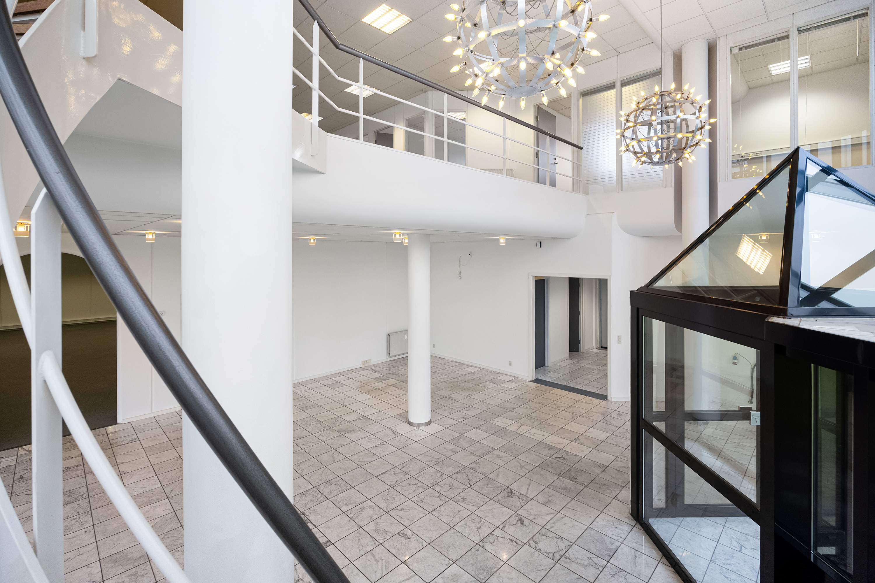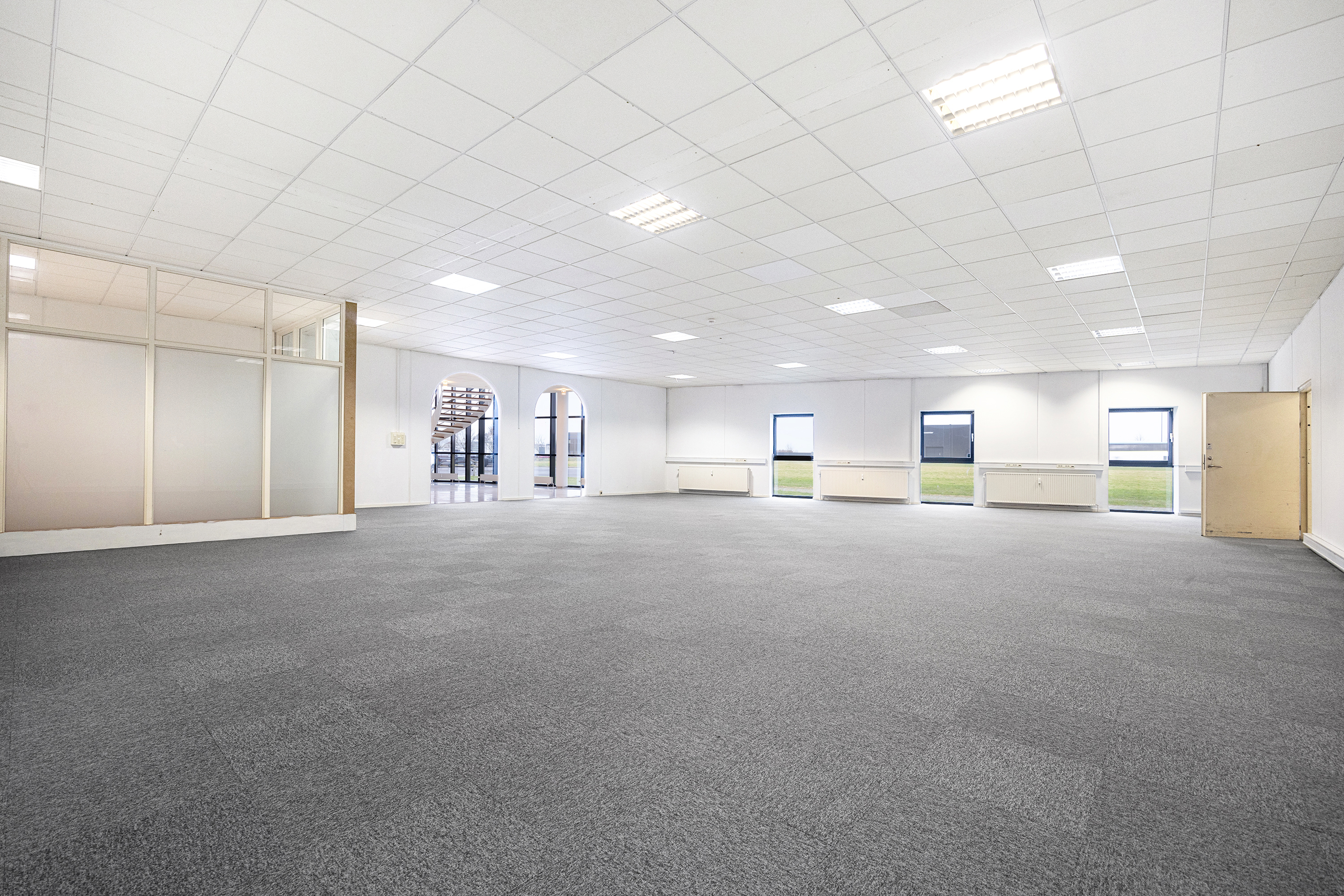 Indbydende og funktionelt – Lejemålet byder på en flot og præsentabel hall med dobbelthøjt loft, klinkegulve og masser af naturligt lys. Stueplan er indrettet med en rummelig indgang, adgang til et stort åbent kontorlandskab, en kantine og to praktiske værksteds-/lagerrum, der også kan tilgås udefra via dobbeltdør.
