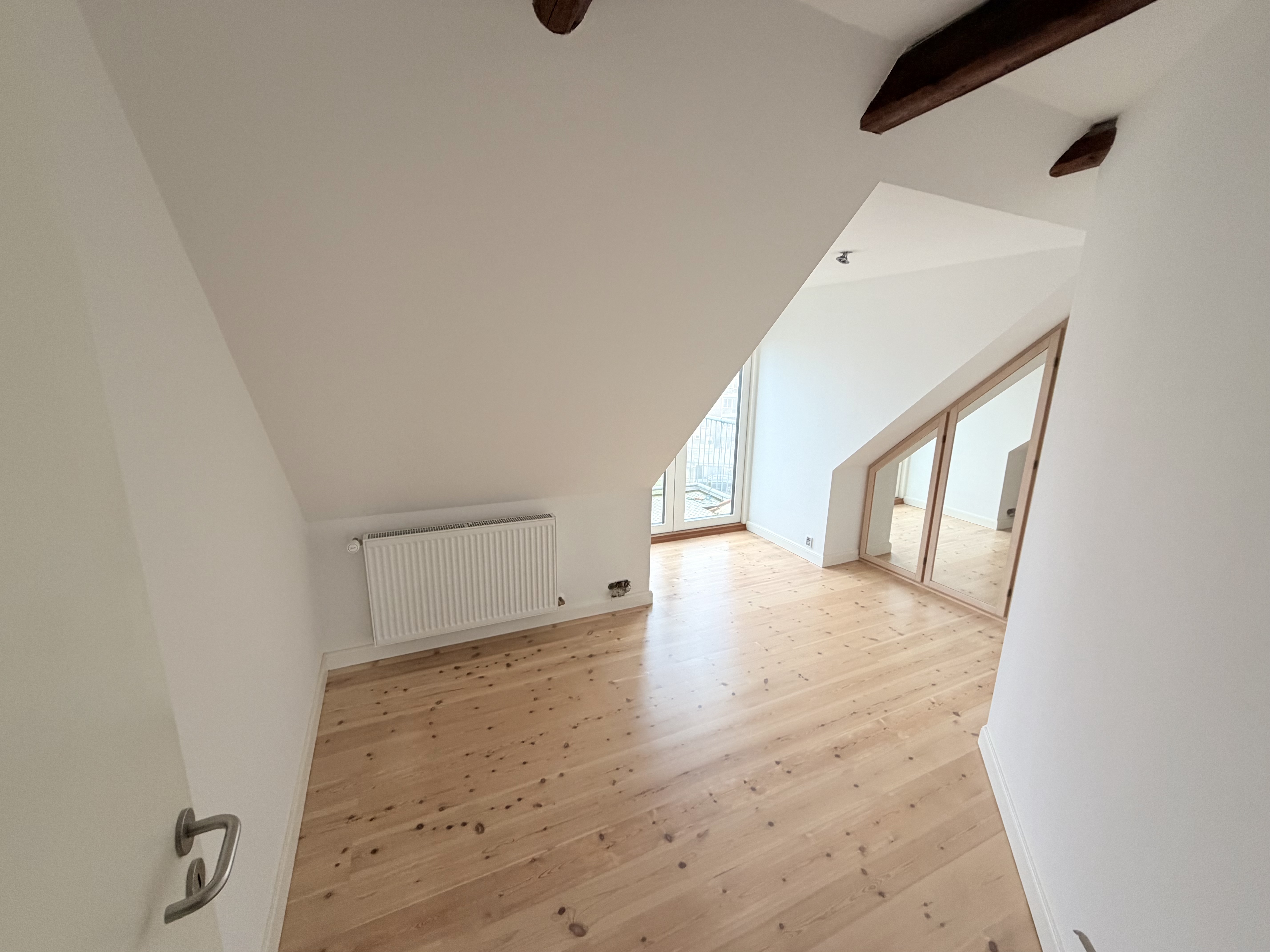 Lejligheden byder på lyse, åbne rum med loft til kip og synlige hanebånd. Perfekt til dig, der ønsker at bo centralt og med masser af plads.