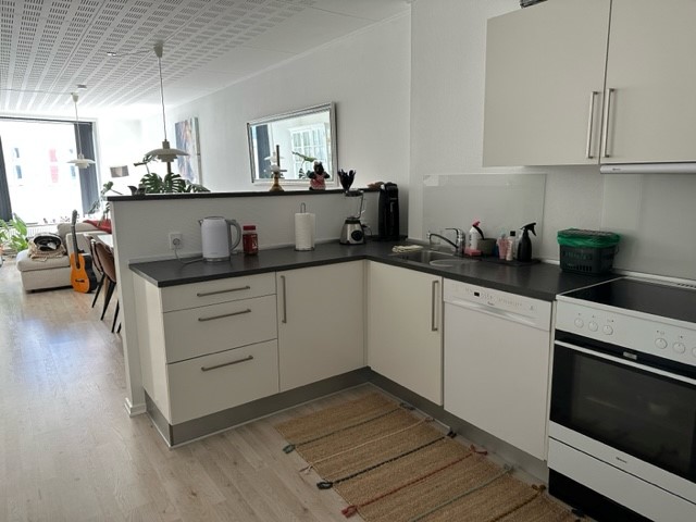 Ved indtrædelse i lejligheden møder man lejlighedens entré med indbyggede skabe. Herfra kommer man ind i lejlighedens køkkenalrum. Køkkenet er med hårde hvidevarer inkl. opvaskemaskine. I stuen er der mulighed for at etablere spiseplads ved siden af køkkenet. Fra stuen er lejemålets nye balkon med udkig til gågaden. I lejemålet er der to soveværelser med indbyggede skabe. Fra det ene soveværelse kan man tilgå badeværelset. Der er klargjort til opstilling af egen vaskemaskine/tørretumbler i rummet ved siden af badeværelset.
