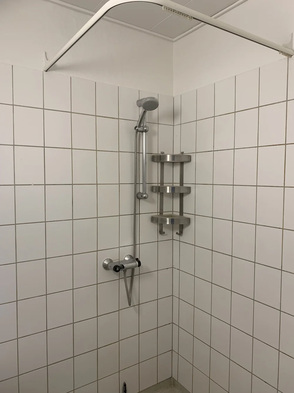 Brusebadeværelse med glasvæg. En pæn lejlighed. Nye vinduer i lejemålet på sydsiden.