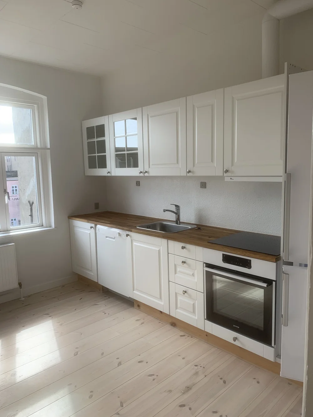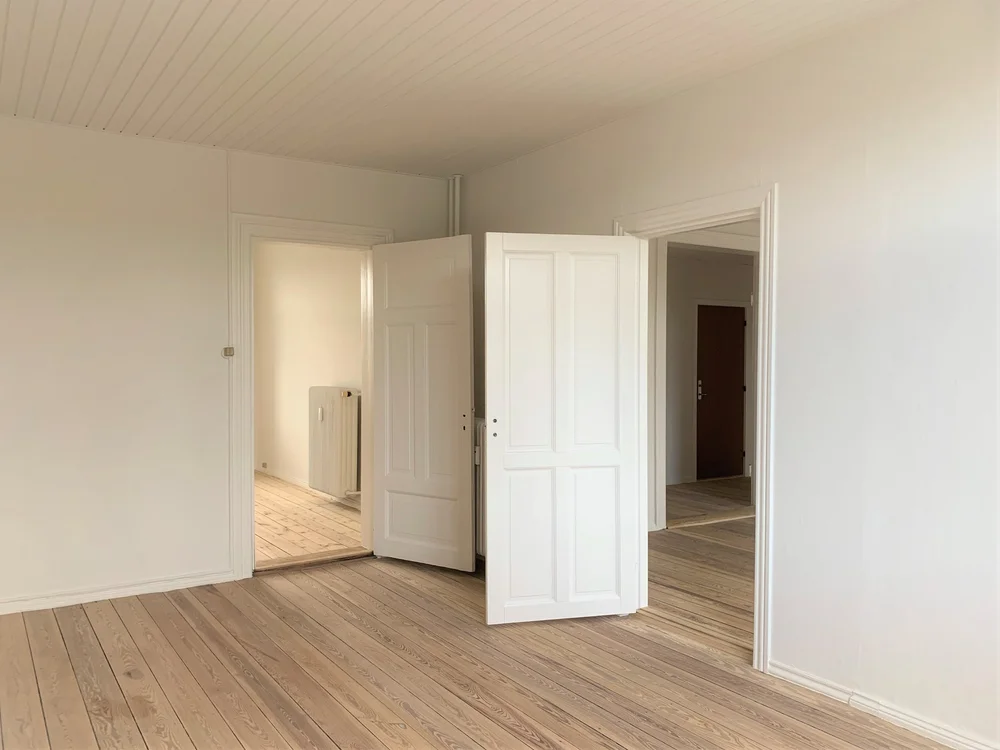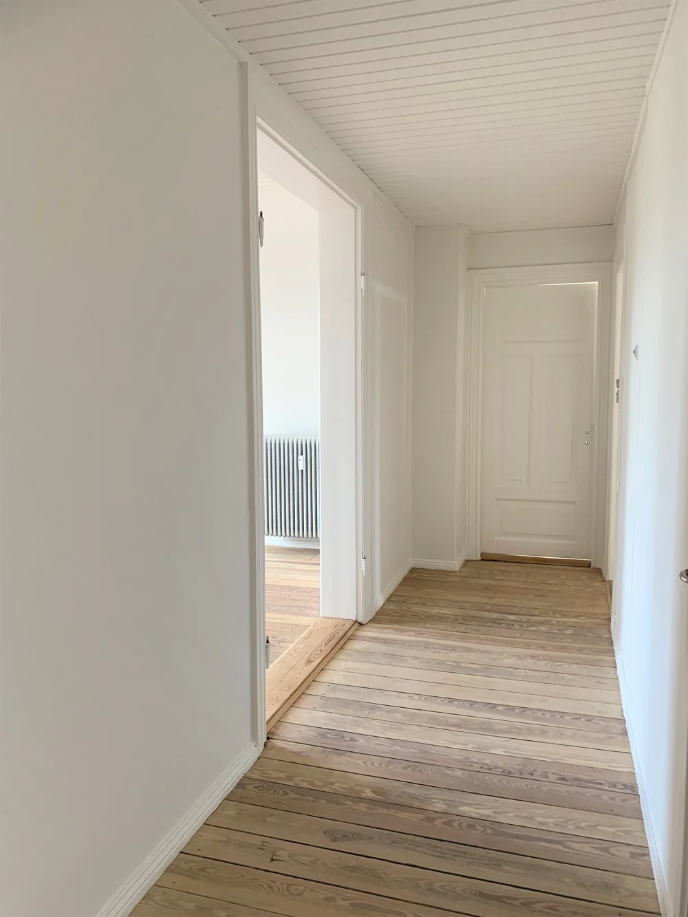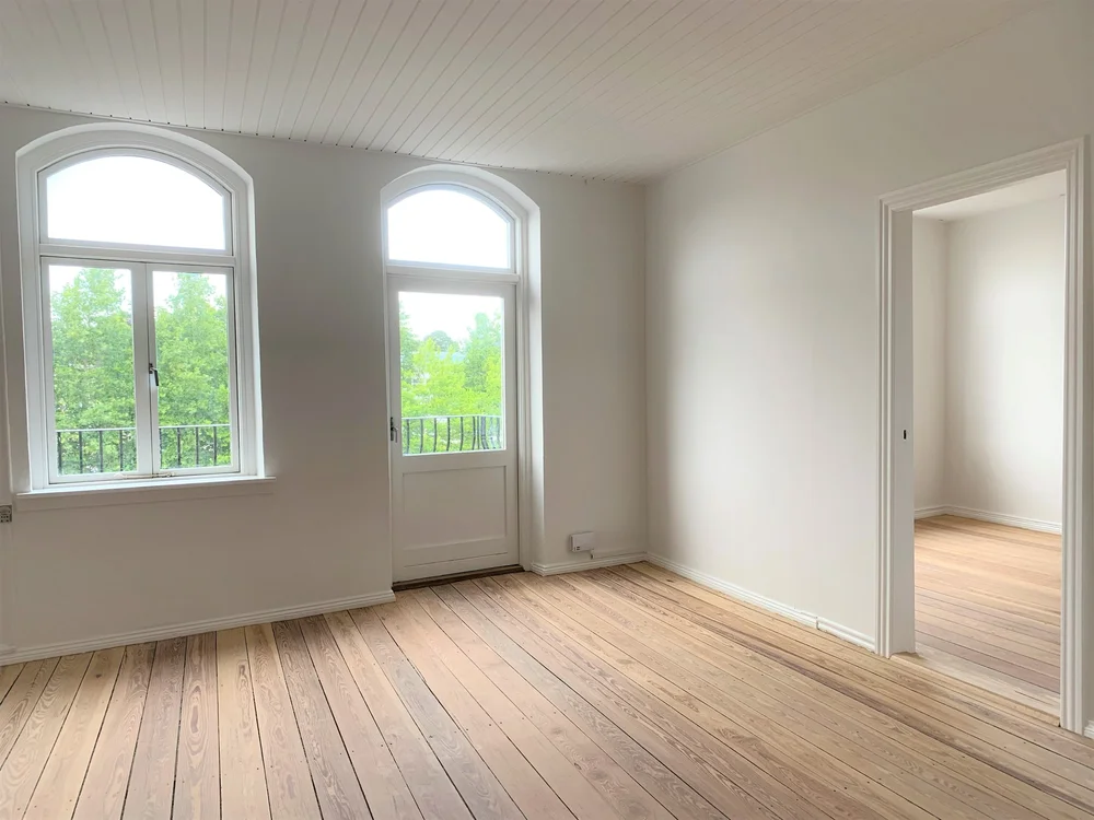 Afhøvlede massive gulve, højt til loftet og godt lys. Her er der plads, lys og luft til flere, i en god istandsat lejlighed.