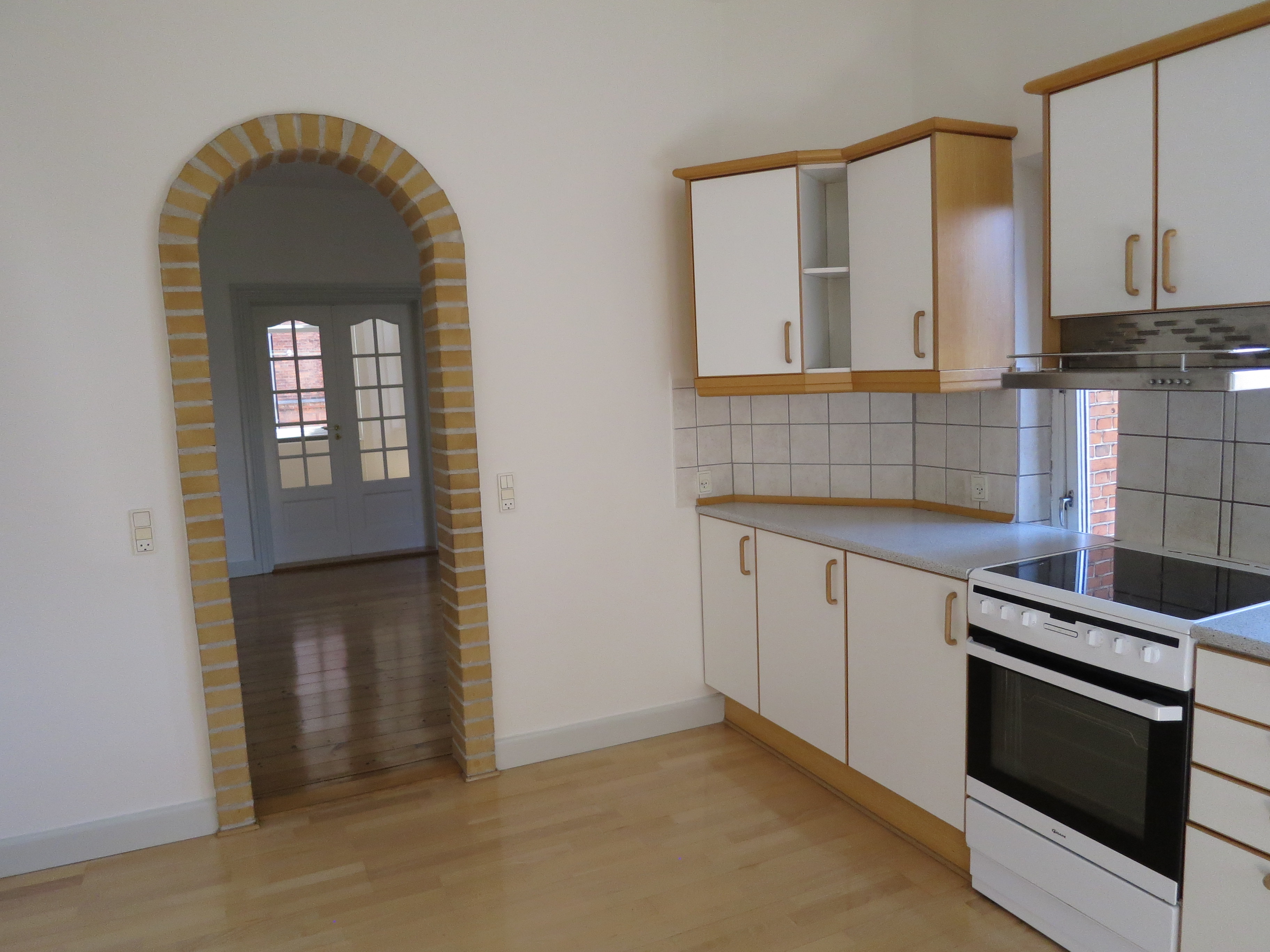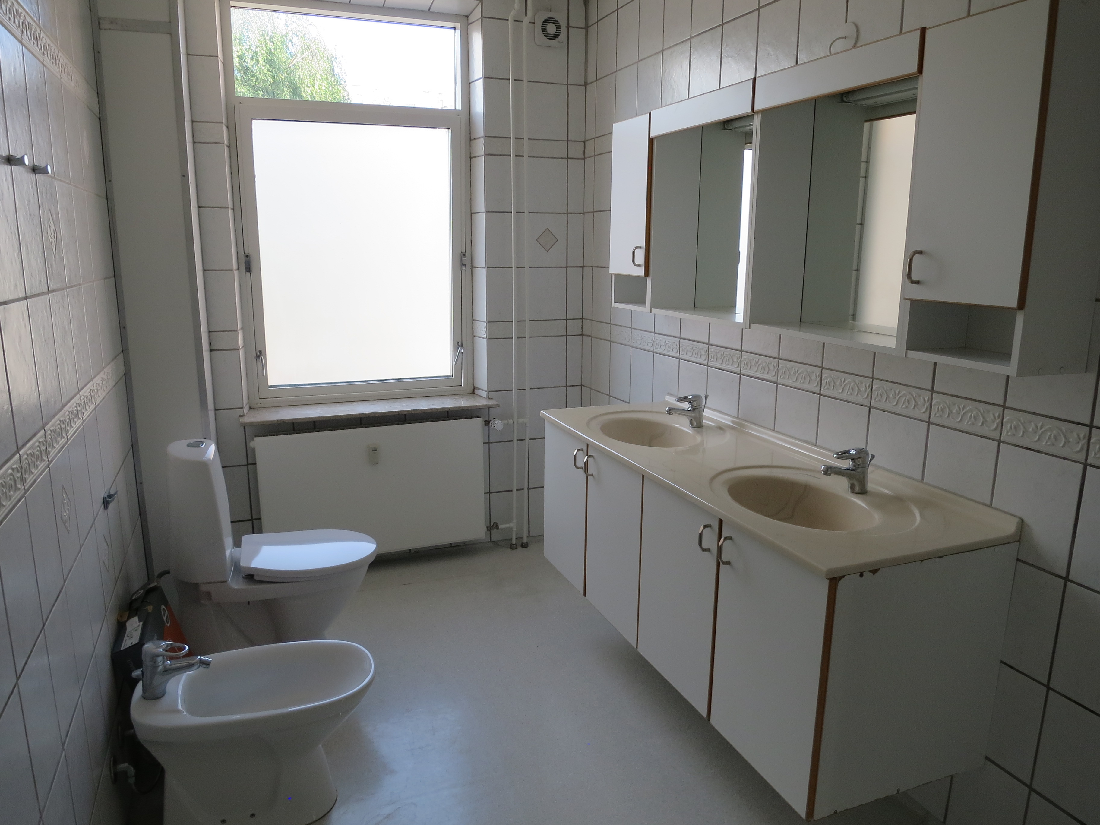 Stort lyst sydvendt køkken med alle hvidevarer, og stort samtalebadeværelse med badeværelsesarrangement (2 håndvaske, bidet og brusekabine).