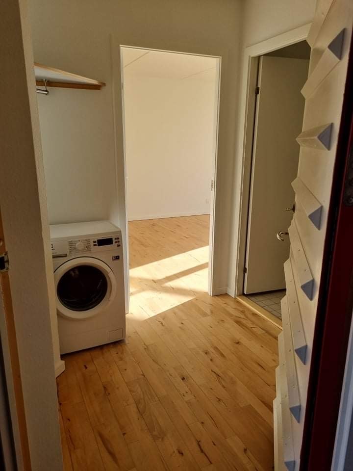 Når du træder ind, bliver du mødt af et rum med smukt trægulv, garderobeplads samt vaskemaskine.
