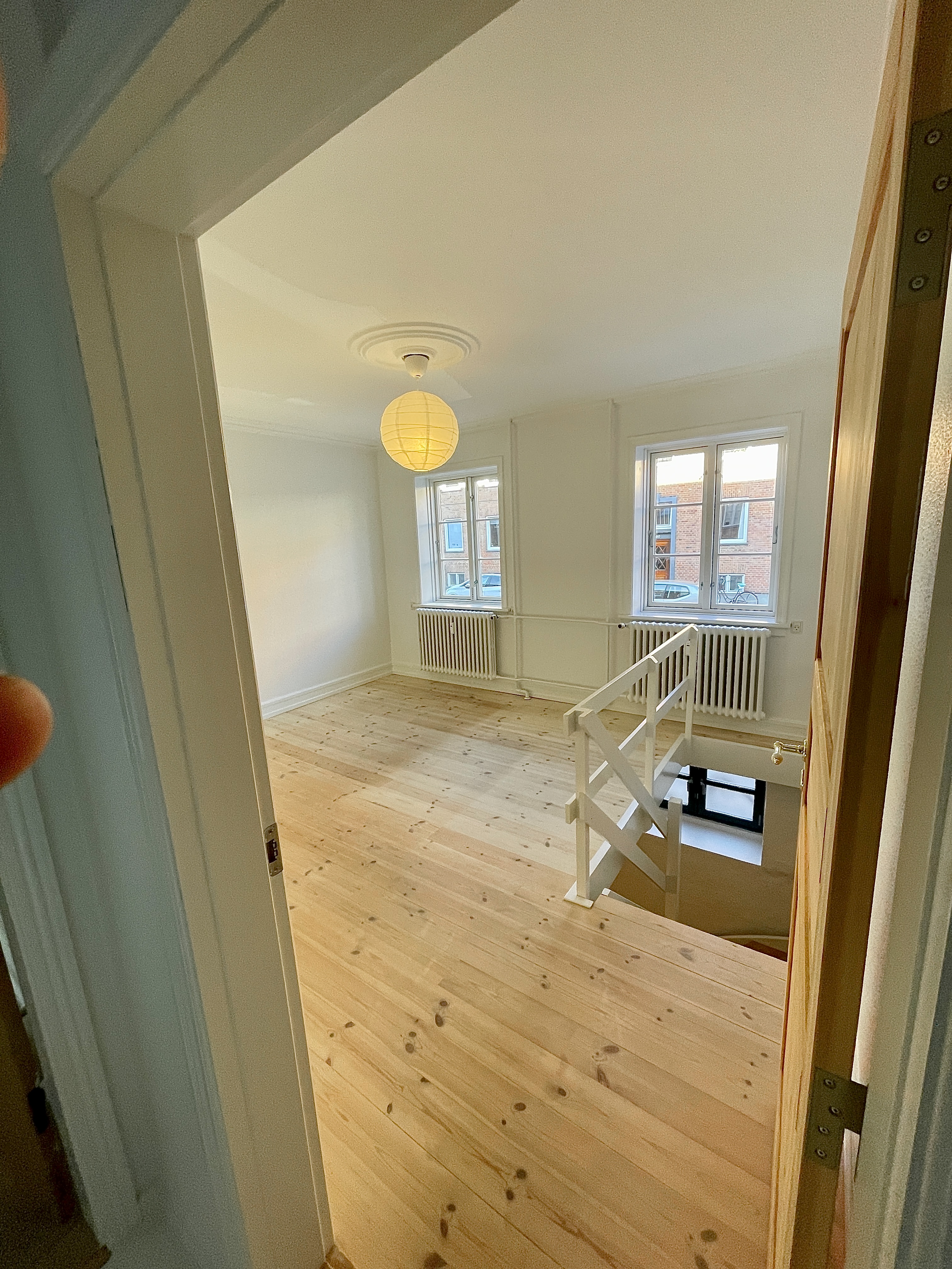 Velindrettet, velholdt hyggelig og lys 3. værelses lejlighed i 2 plan. Høj stuelejlighed uden indkig på 70 kvm. med trappe i stuen ned til værelse. Meget velegnet til par. Ejendommen er gennemgående renoveret i 2004 inklusiv. alle installationer mv. Lejligheden overtages nymalet. Ejendommen emmer af det gamle Aarhus. Ligger i en meget rolig gade. Der er hyggelig gårdhave med legeplads, frugttræer og grillplads. Hyggelig opgang med rolige lejere. Lejligheden ligger i et klassisk trygt ejendomskompleks med kun 2 etager med stor lukket fællesgård. Der er kælderrum (pulterum) tilknyttet lejligheden og der forefindes vask og tumbler der kan anvendes mod mindre betaling.