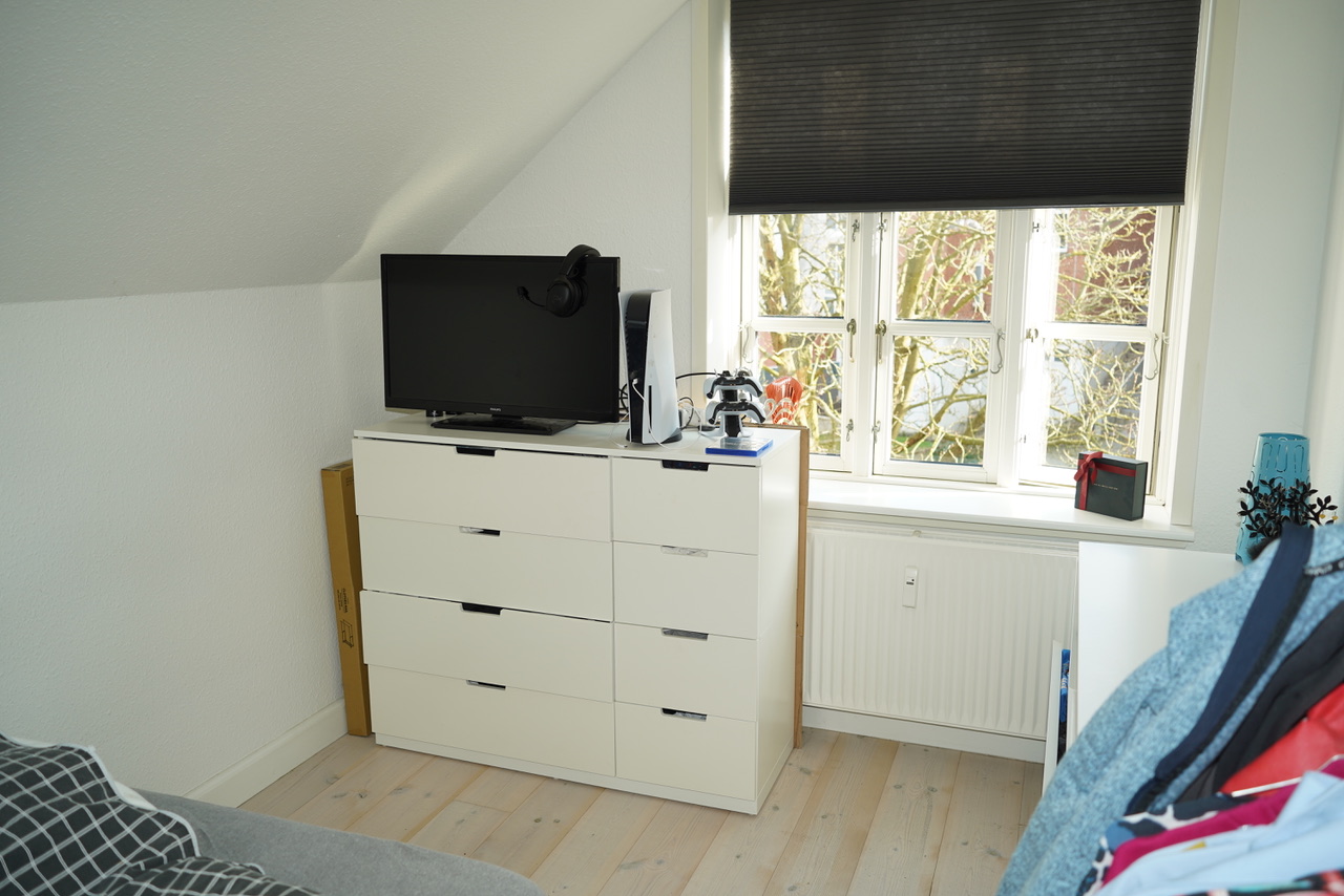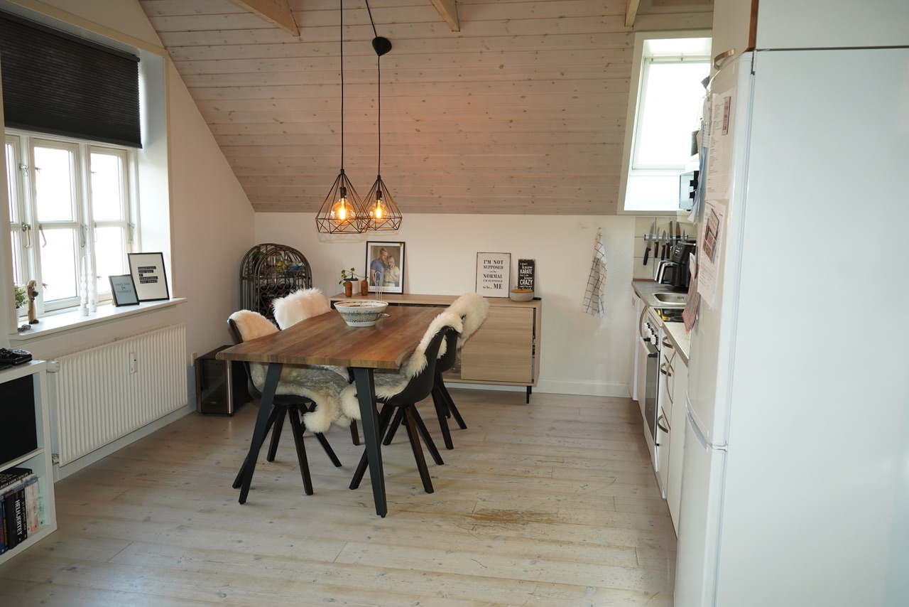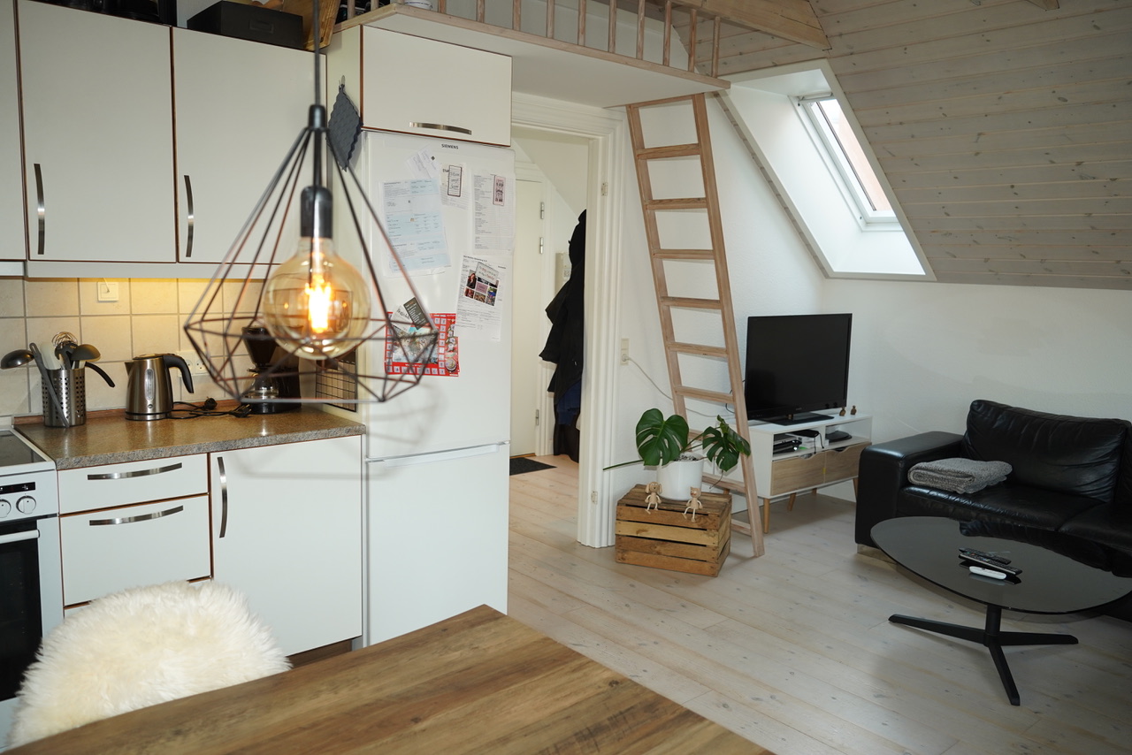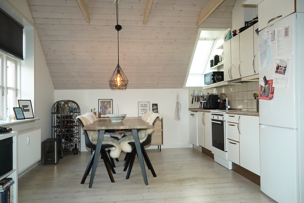 Lejligheden indeholder: Stor opholds- og spisestue som er åben til kip og med hems. Køkkenafsnittet er med opvaskemaskine. Rummelig og anvendelig entré. sove-/arbejdsværelse og et fint badeværelse med plads til vaskemaskine. Bag ejendommen er der en lille have med direkte adgang til grønne fællesarealer. God beliggenhed tæt på midtbyen på rolig vej med gode parkeringsmuligheder.