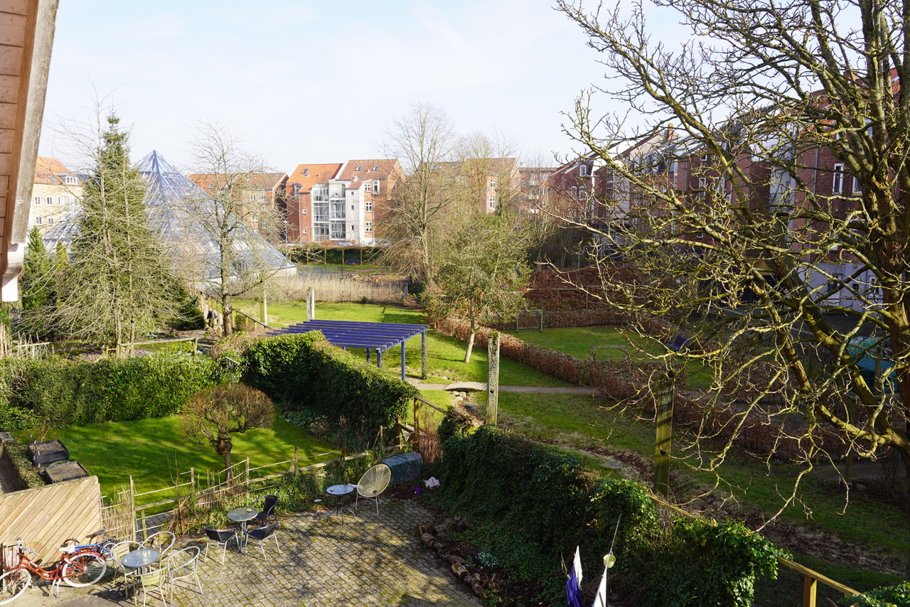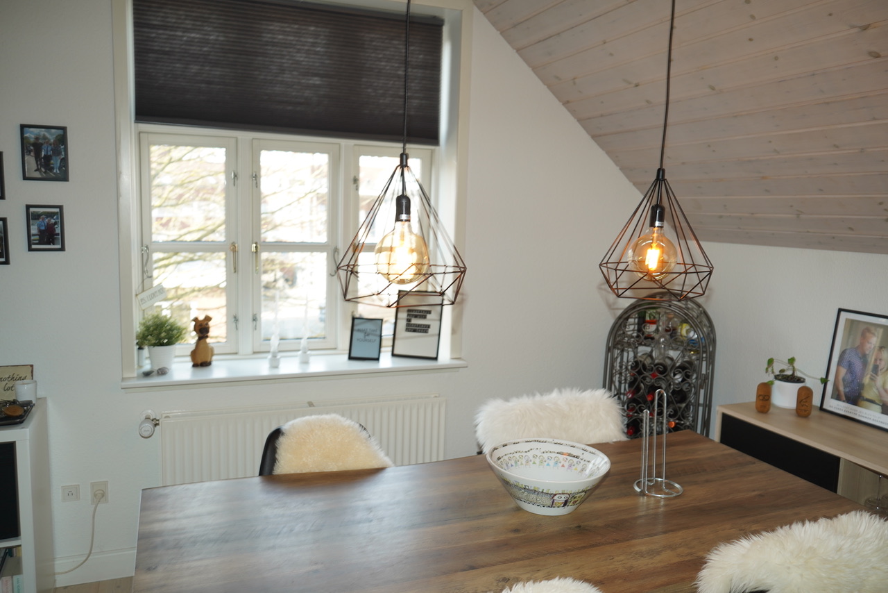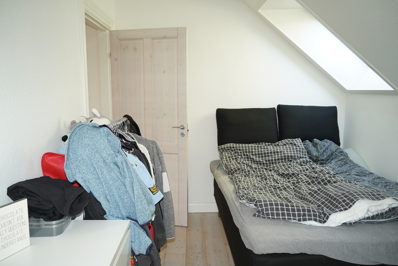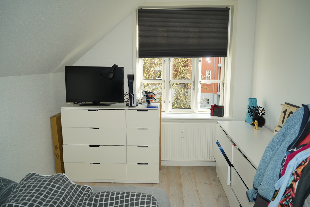 Lejligheden indeholder: Stor opholds- og spisestue som er åben til kip og med hems. Køkkenafsnittet er med opvaskemaskine. Rummelig og anvendelig entré. sove-/arbejdsværelse og et fint badeværelse med plads til vaskemaskine. Bag ejendommen er der en lille have med direkte adgang til grønne fællesarealer. God beliggenhed tæt på midtbyen på rolig vej med gode parkeringsmuligheder.