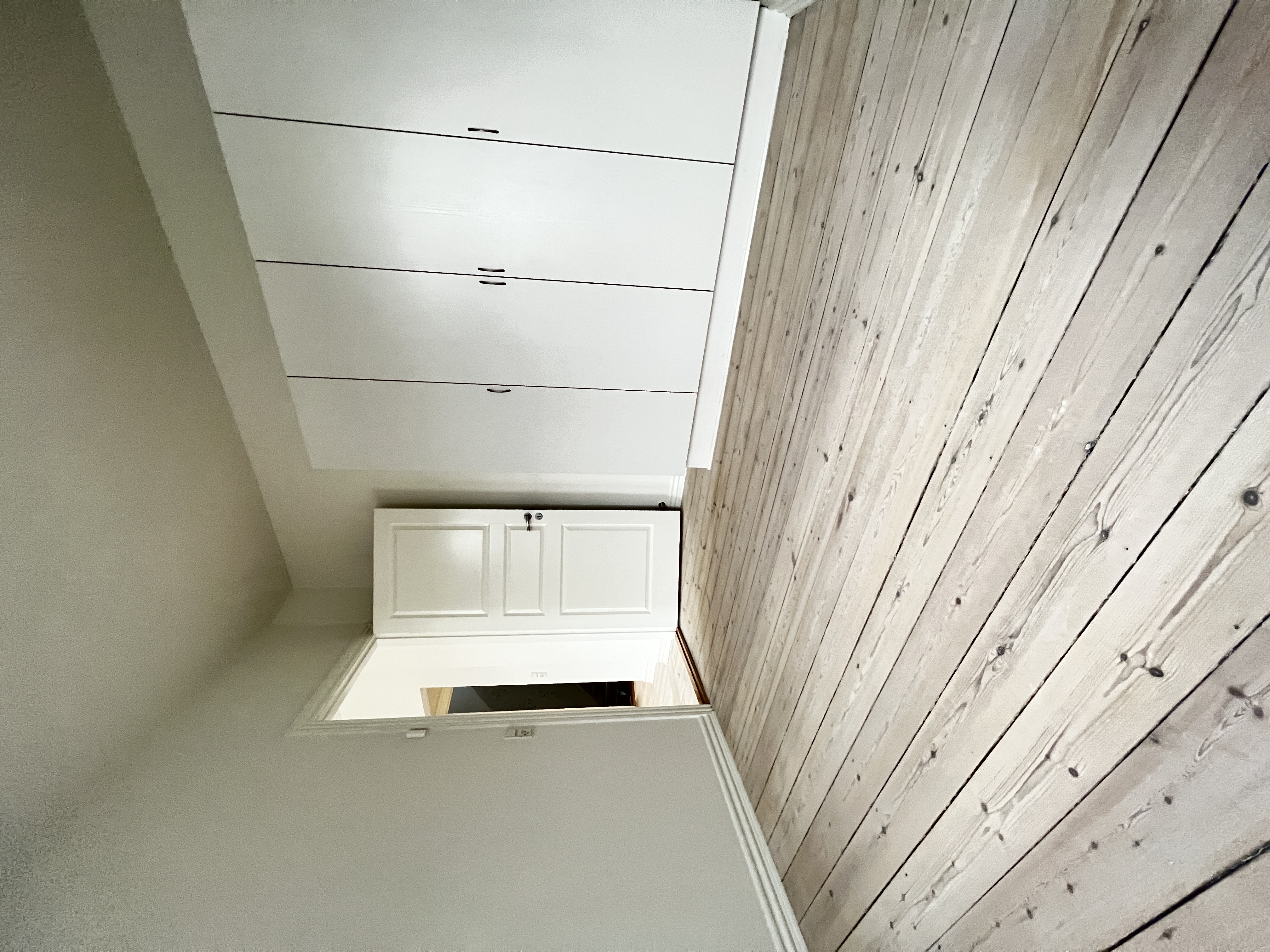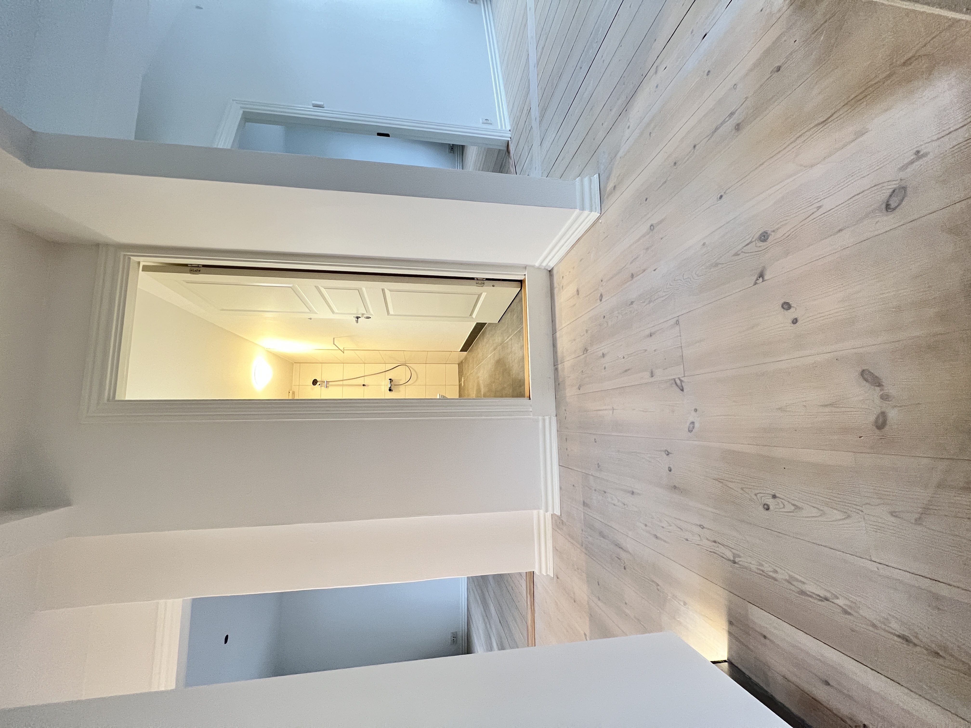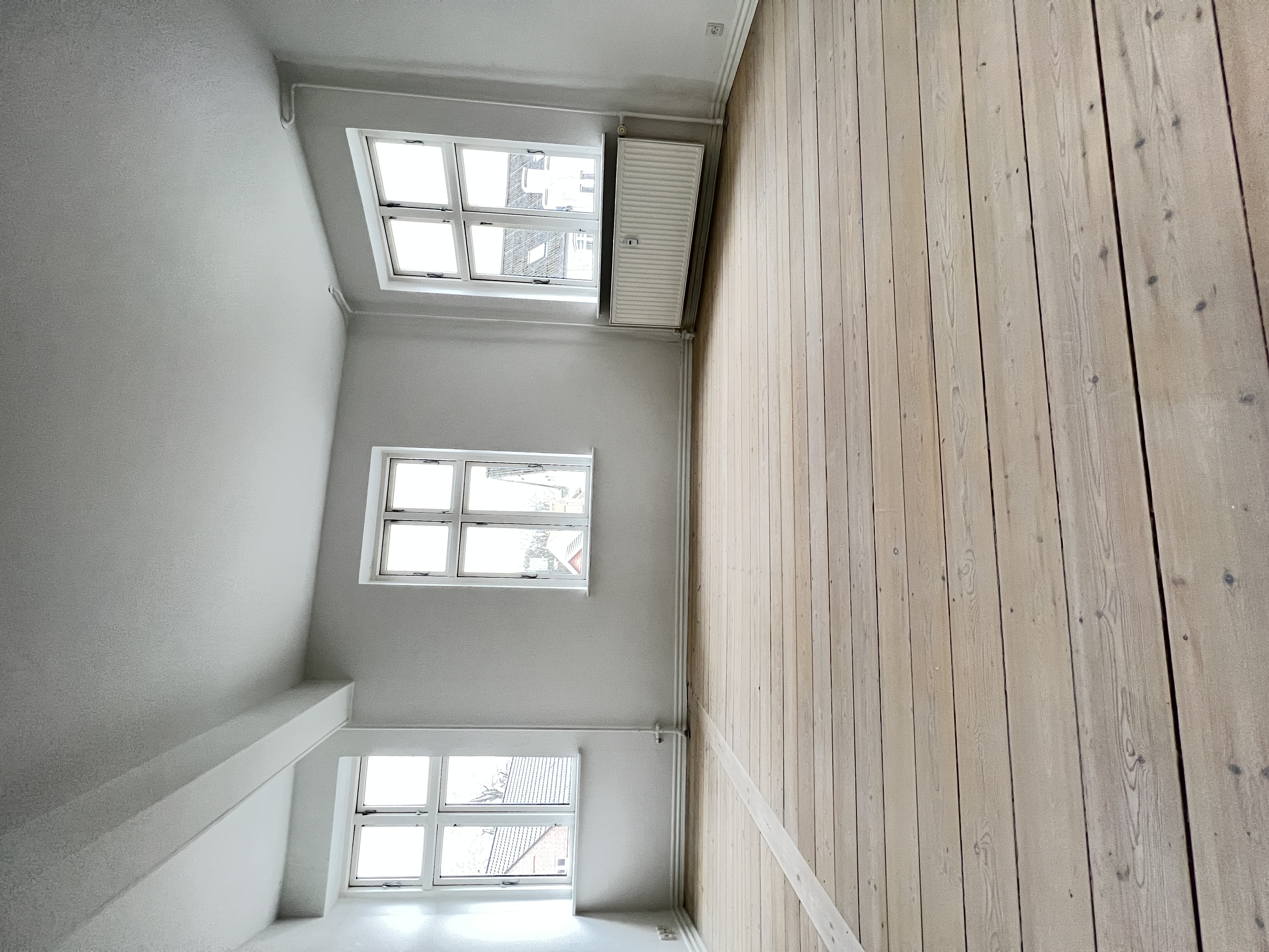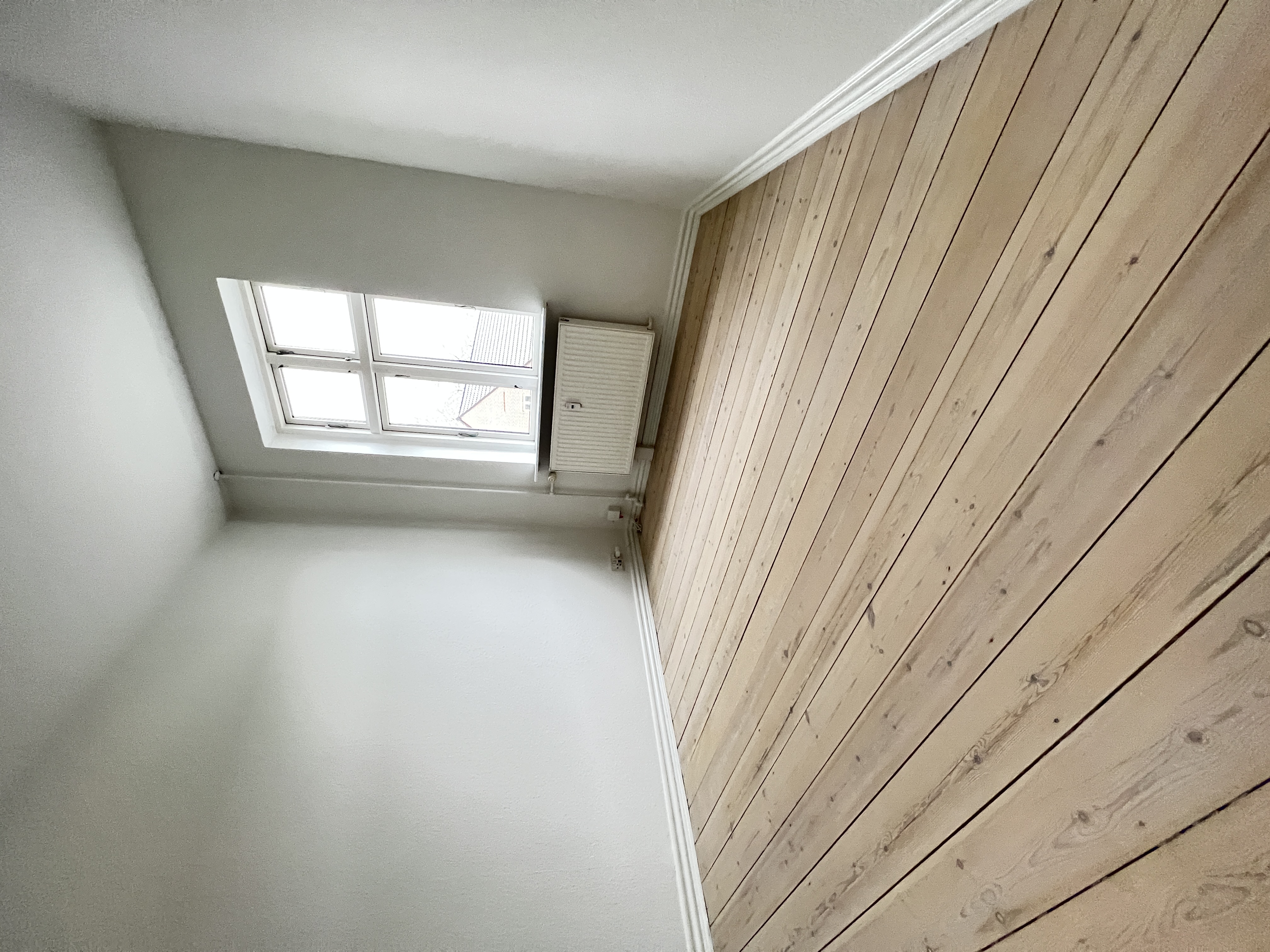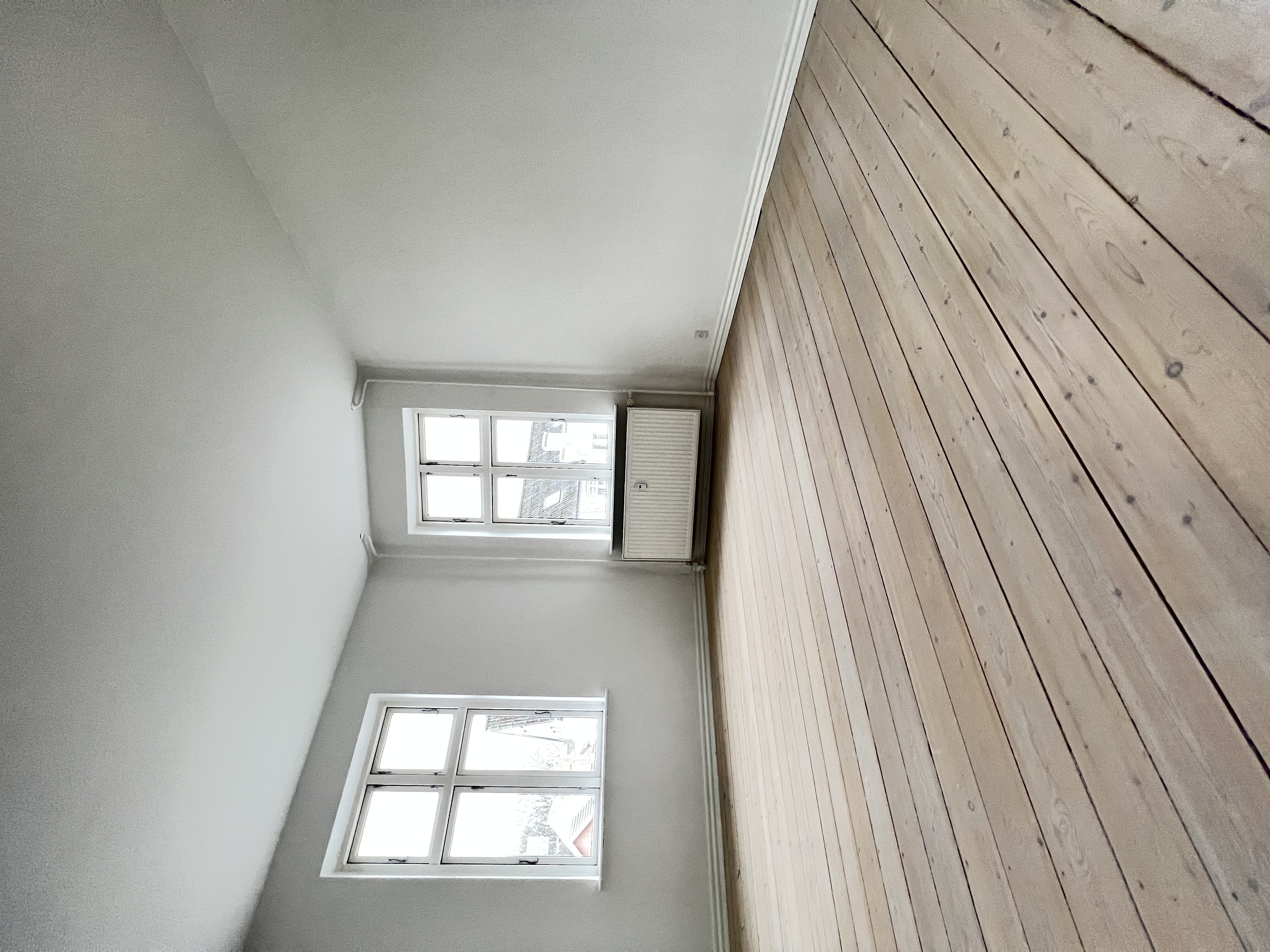 Når du træder ind i lejlighedens entré ligger badeværelset overfør entrédøren, hvor der er gulvvarme og mulighed for tilslutning af egen vaskemaskine og tørretumbler. På venstre hånd finder du det hyggelige køkken med hvideelementer, hvor der er mulighed for at have en mindre spiseplads eller ekstra opbevaring. Videre fra køkkenet kan du finde lejlighedens første værelse, hvor der er indbygget skabsplads og adgang til altanen, hvor der er udsigt til det hyggelige gademiljø.