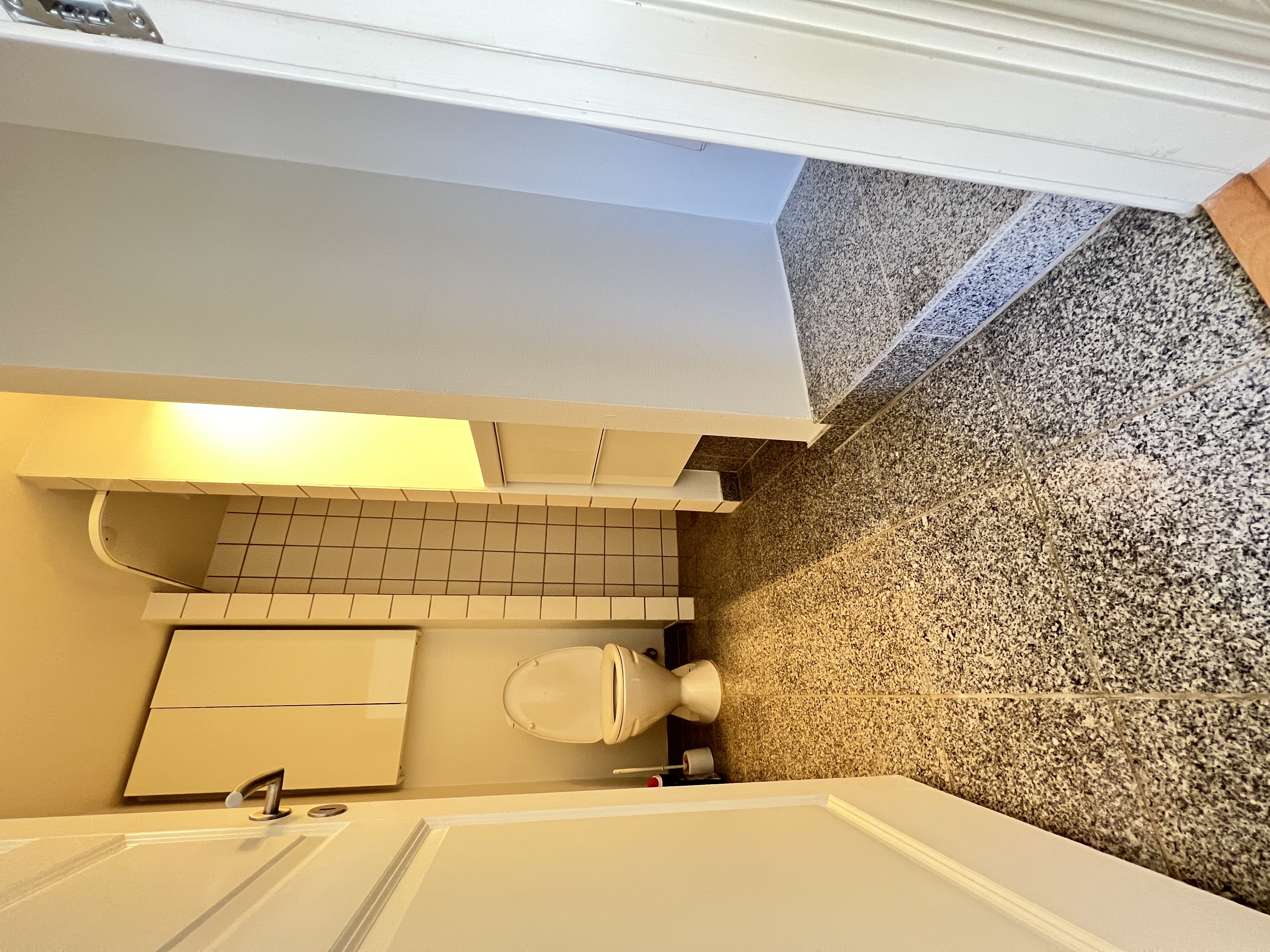 Når du træder ind i lejligheden, befinder du dig i entreen. Herfra kan du tilgå badeværelset, hvor der er plads til opsætning af egen vaskemaskine og tørretumbler. Gulvet er granitklinker.