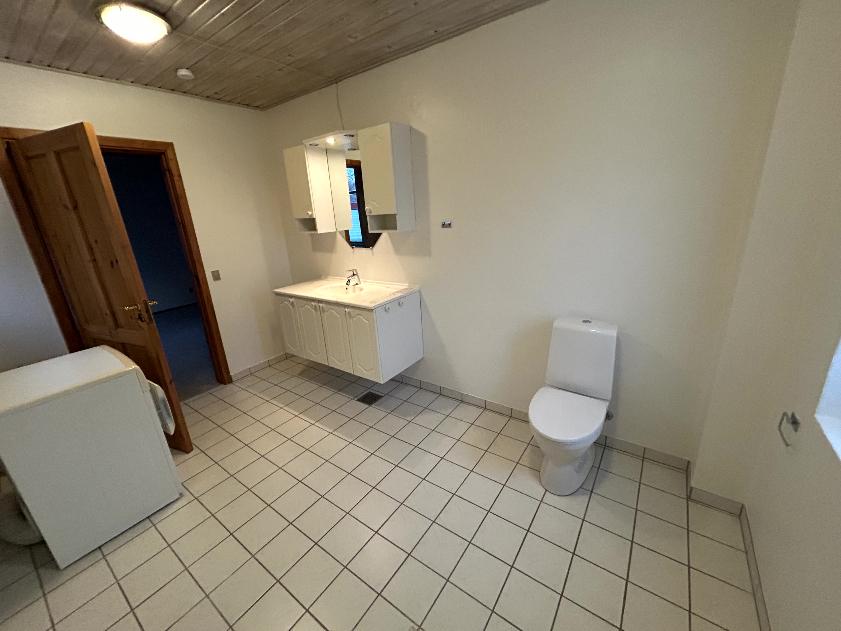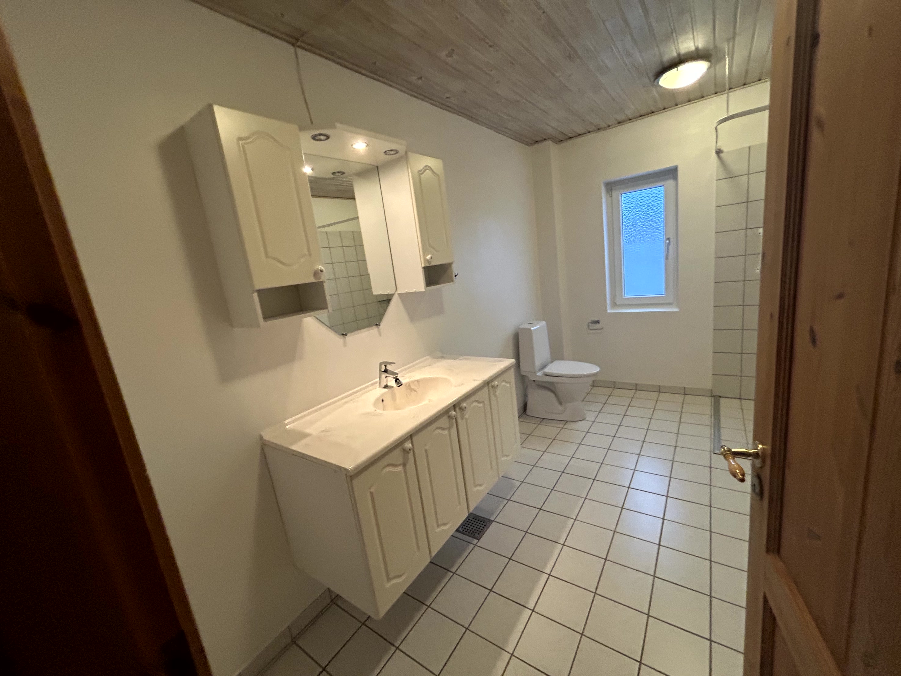 Der er fra soveværelset adgang til det store badeværelse, som er med gulvvarme og lyst indrettet.