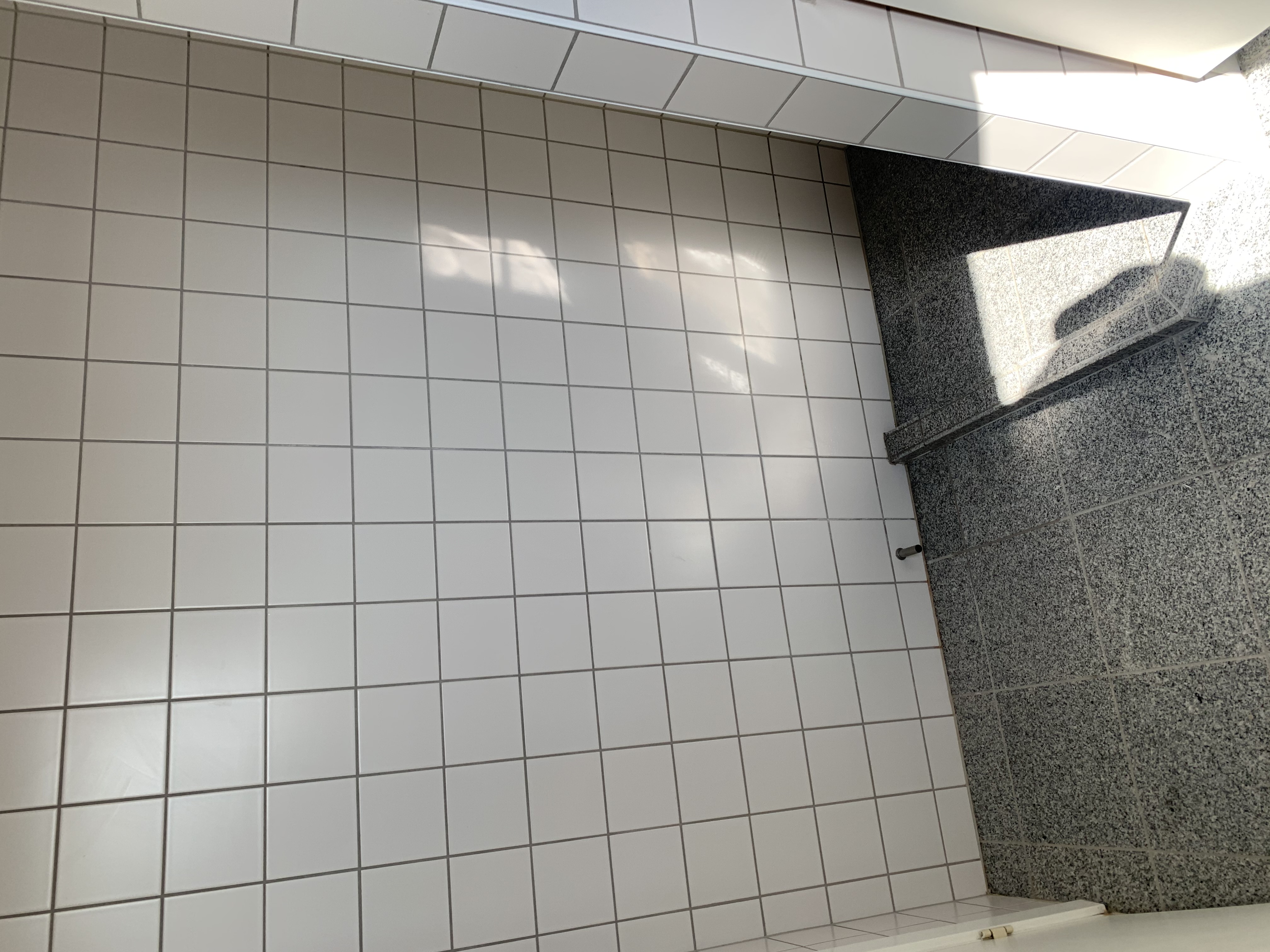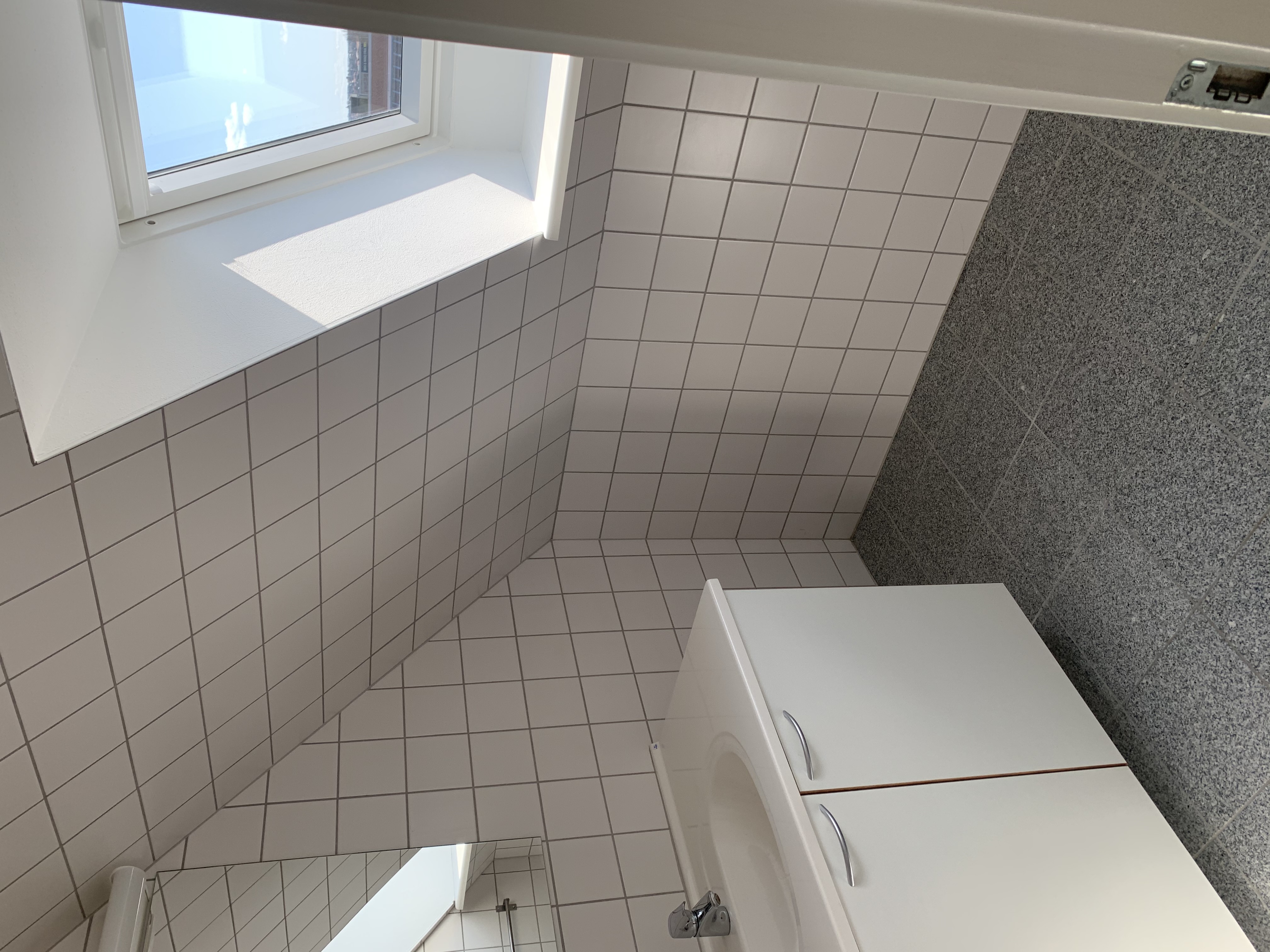 Til venstre for entreen, er lejemålets toilet. Badeværelset er nemlig opdelt i to rum. Fortsætter man ind i stuen, finder man på højre hånd det rummelige badeværelse, hvor der er plads til opsæt af egen vaske/tørremaskine.
