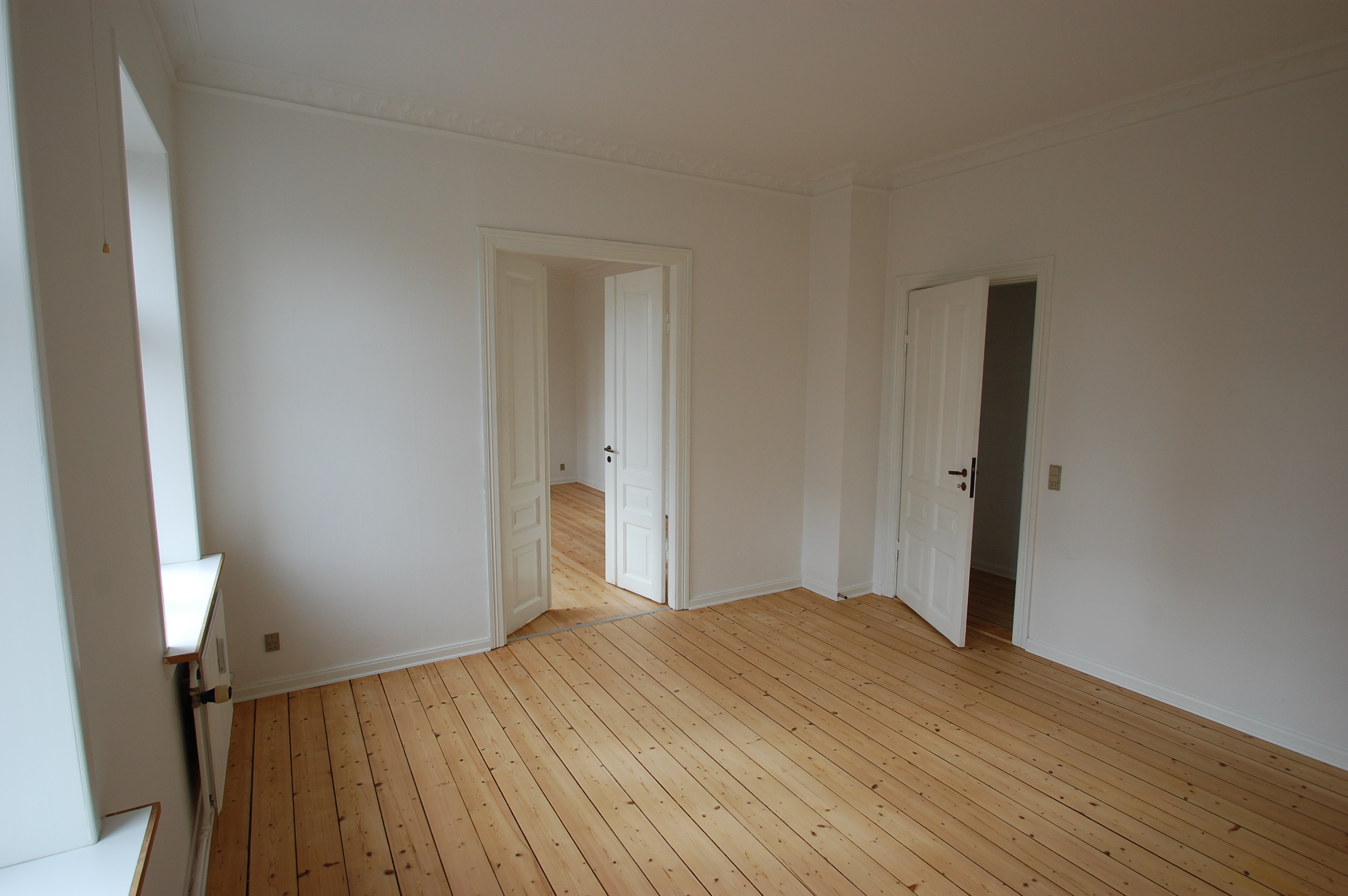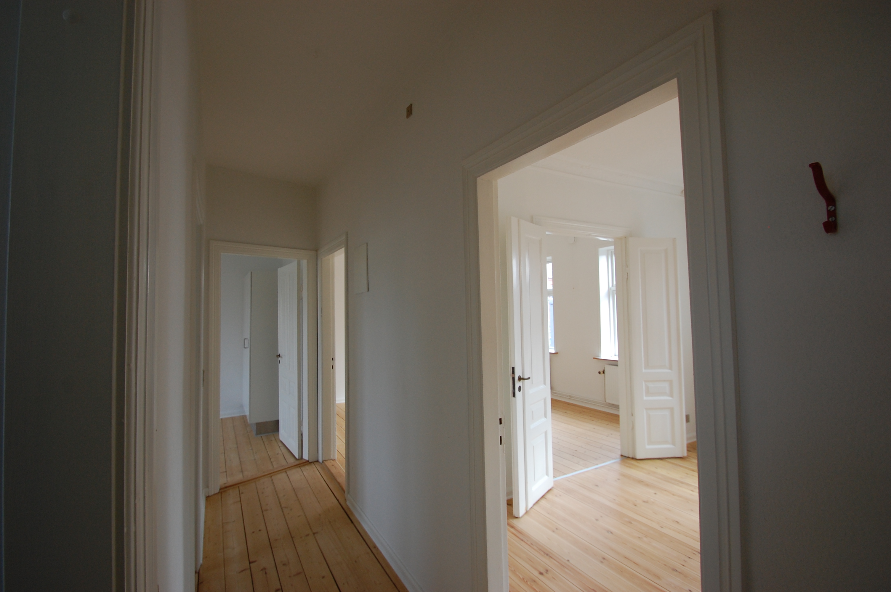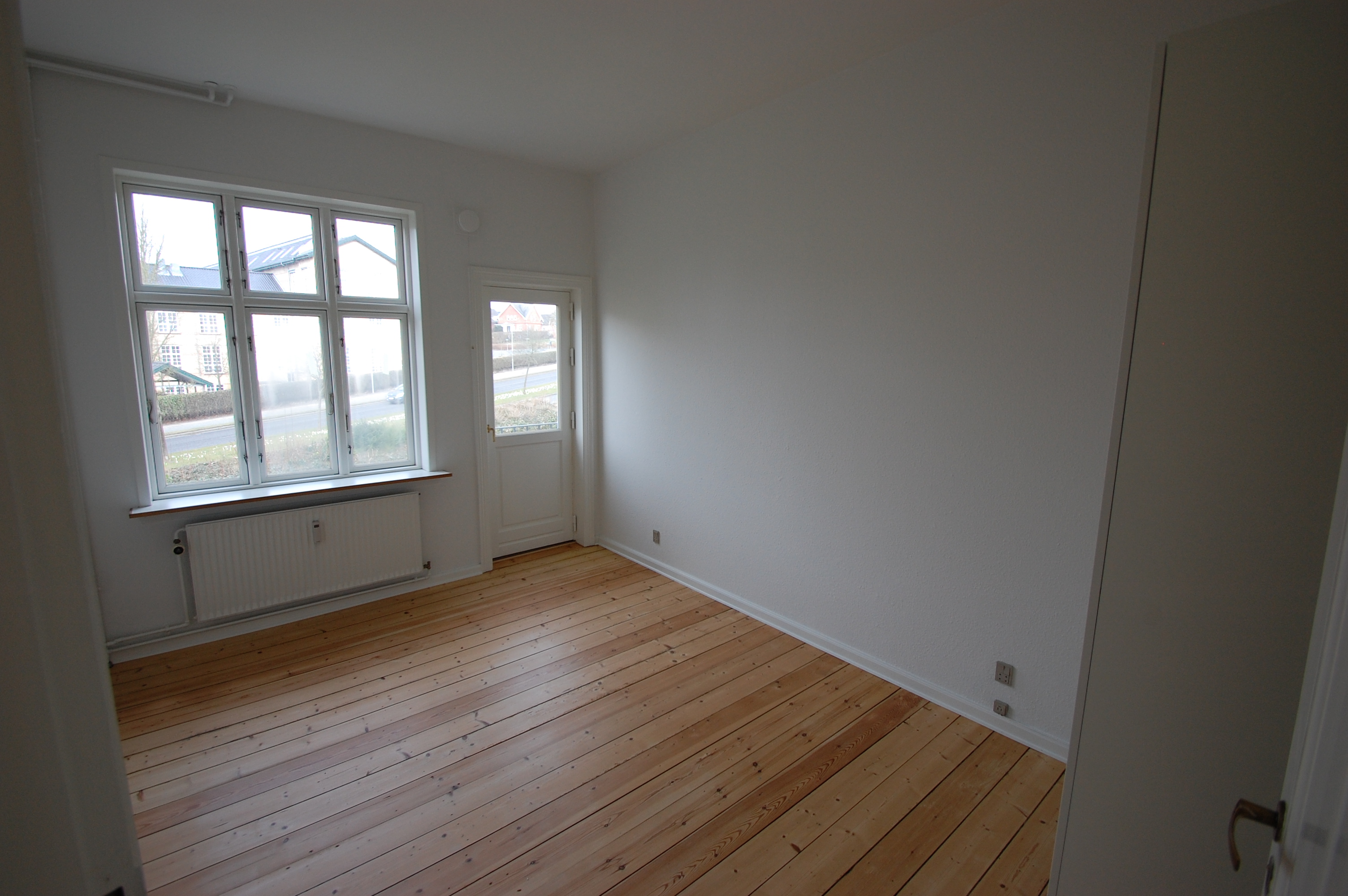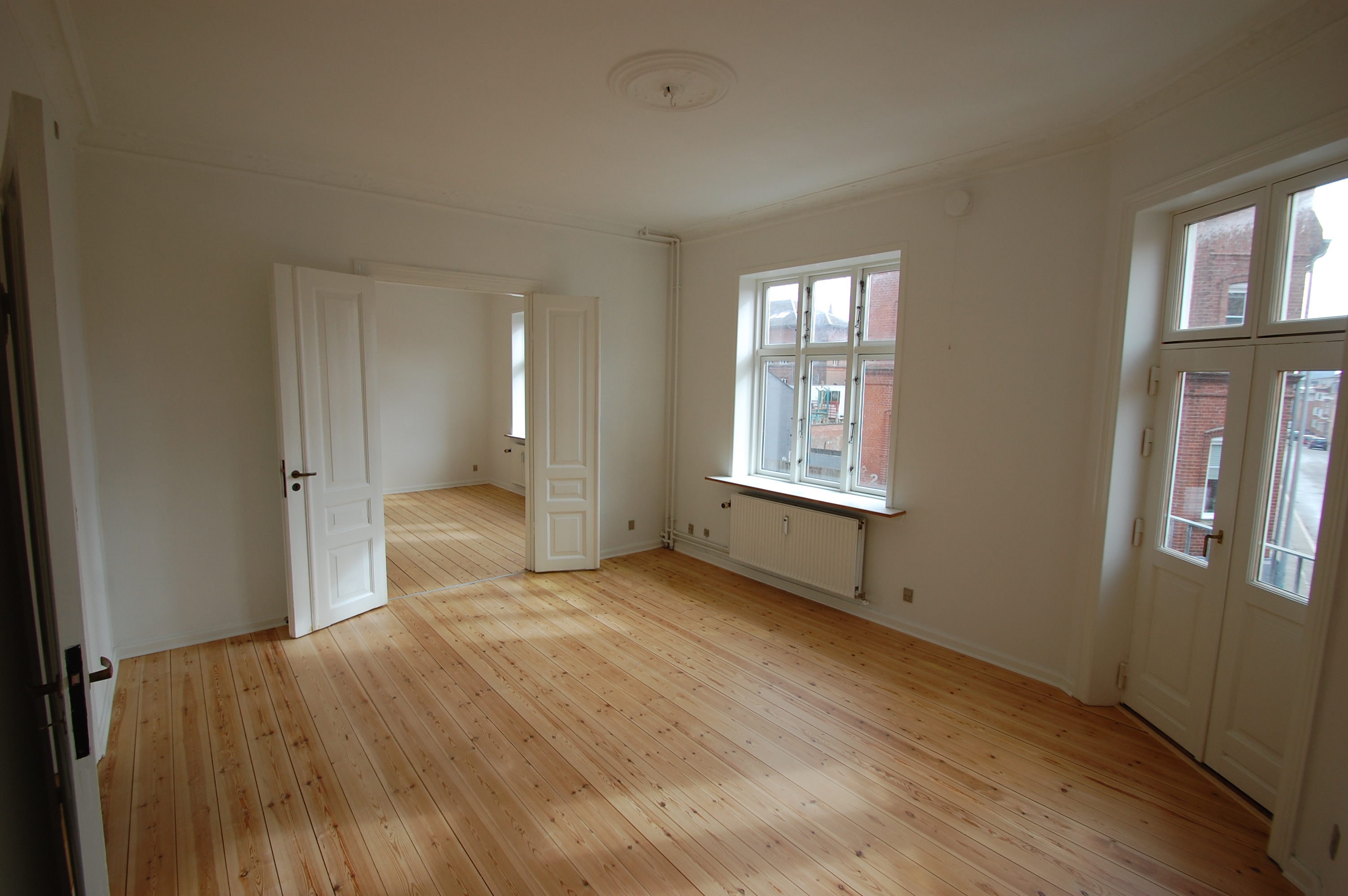 2 større sammenhængende stuer med franske døre og fransk altan. Pæn fordelingsgang, soveværelse med indbygget skab og ligeledes fransk altan.