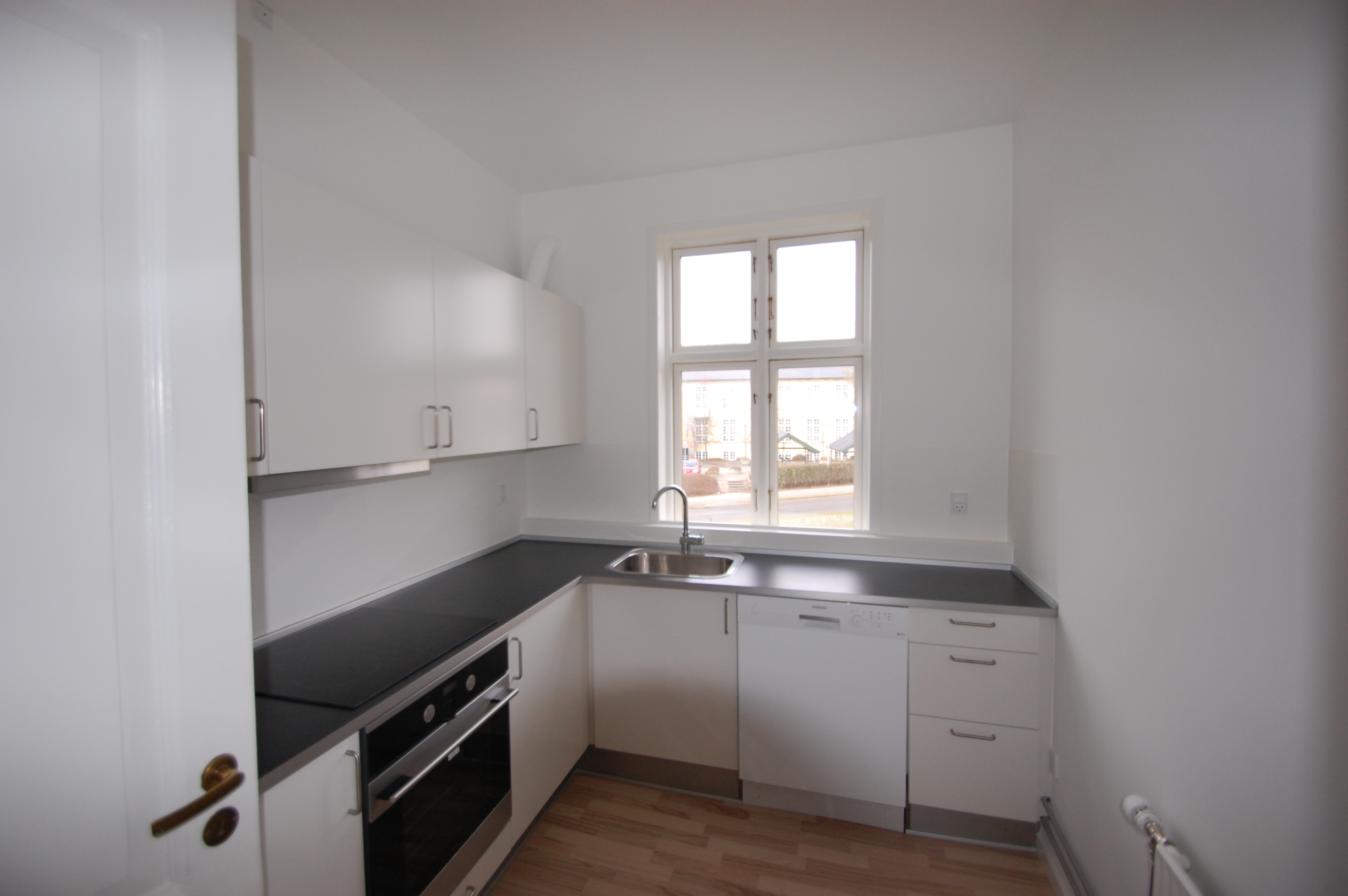 med nyere køkken, opvaskemaskine, køle-/fryseskab m.v.