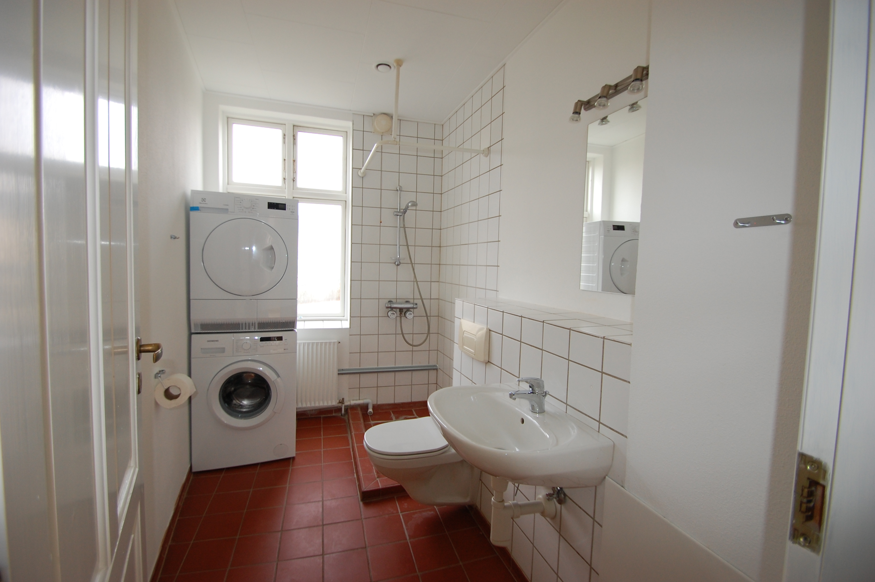 Større badeværelse med brus og egen vaskemaskine og tørretumbler.