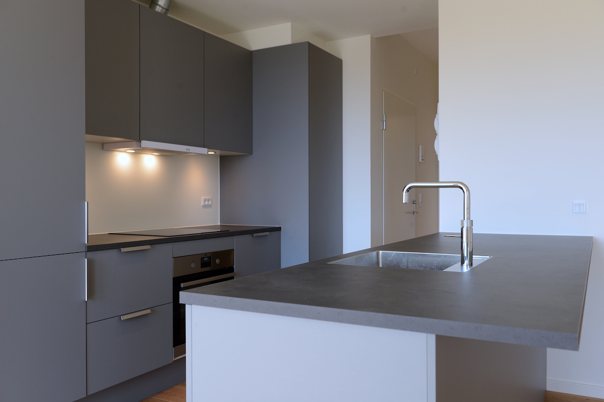 Lækker ny bygget penthouse lejlighed på 6. etage på hele 91 m2 midt på Nørrebro med udsigt over Mimers Plads og byens tage.