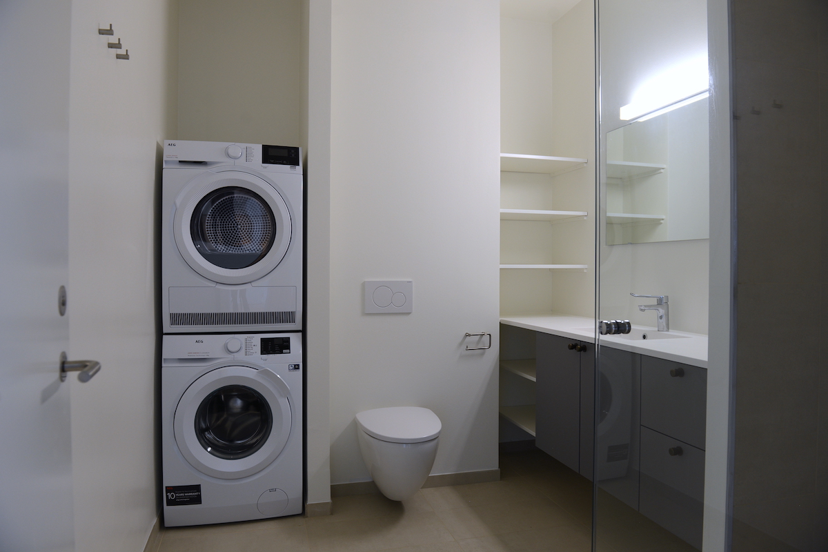 På badeværelset er der brus, og der forefindes vaskemaskine og tørretumbler.