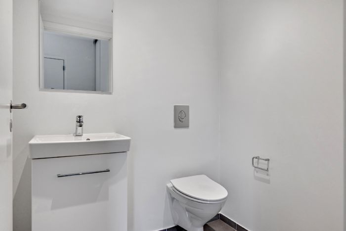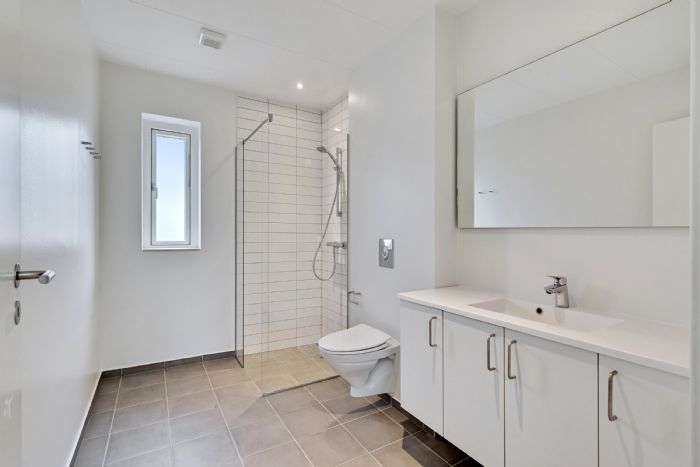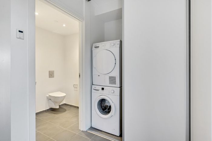 Når du træder ind i boligen er der en stor entre med grå klinker, afskærmet vaskesøjle med vaskemaskine og tørretumbler. Foruden garderobe-/opbevaringsplads bag skydelåge. Fra entreen har du endvidere adgang til toilet, således 1. salen kan holdes privat.