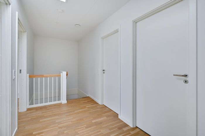På 1. salen er der 3 værelser med skabe og en repos med ovenlys, hvor der er plads til indretning af fx kontorplads. Husets badeværelse er ligeledes placeret på 1. sal, indrettet med væghængt toilet, bruser og stort toiletmøbel.