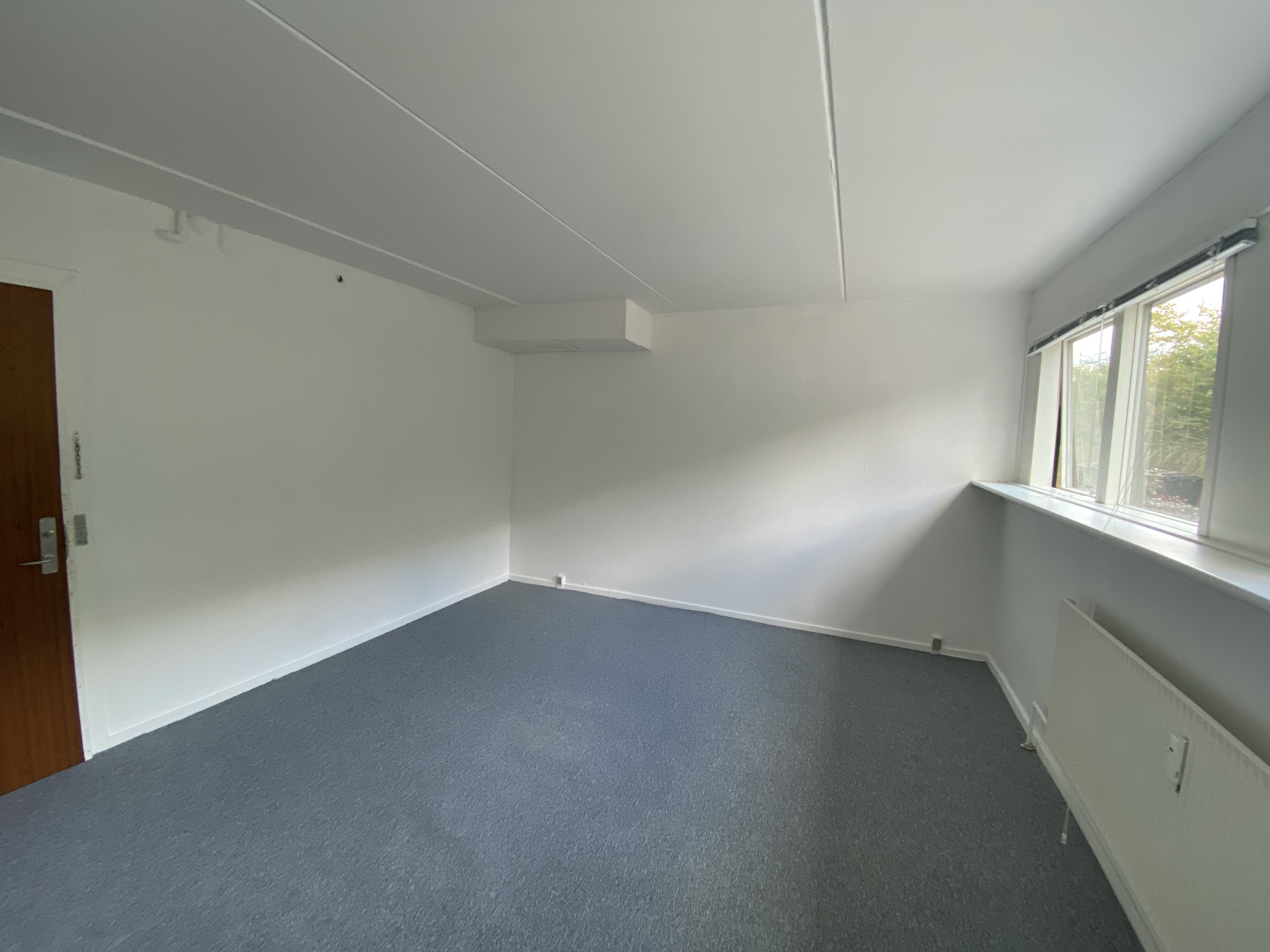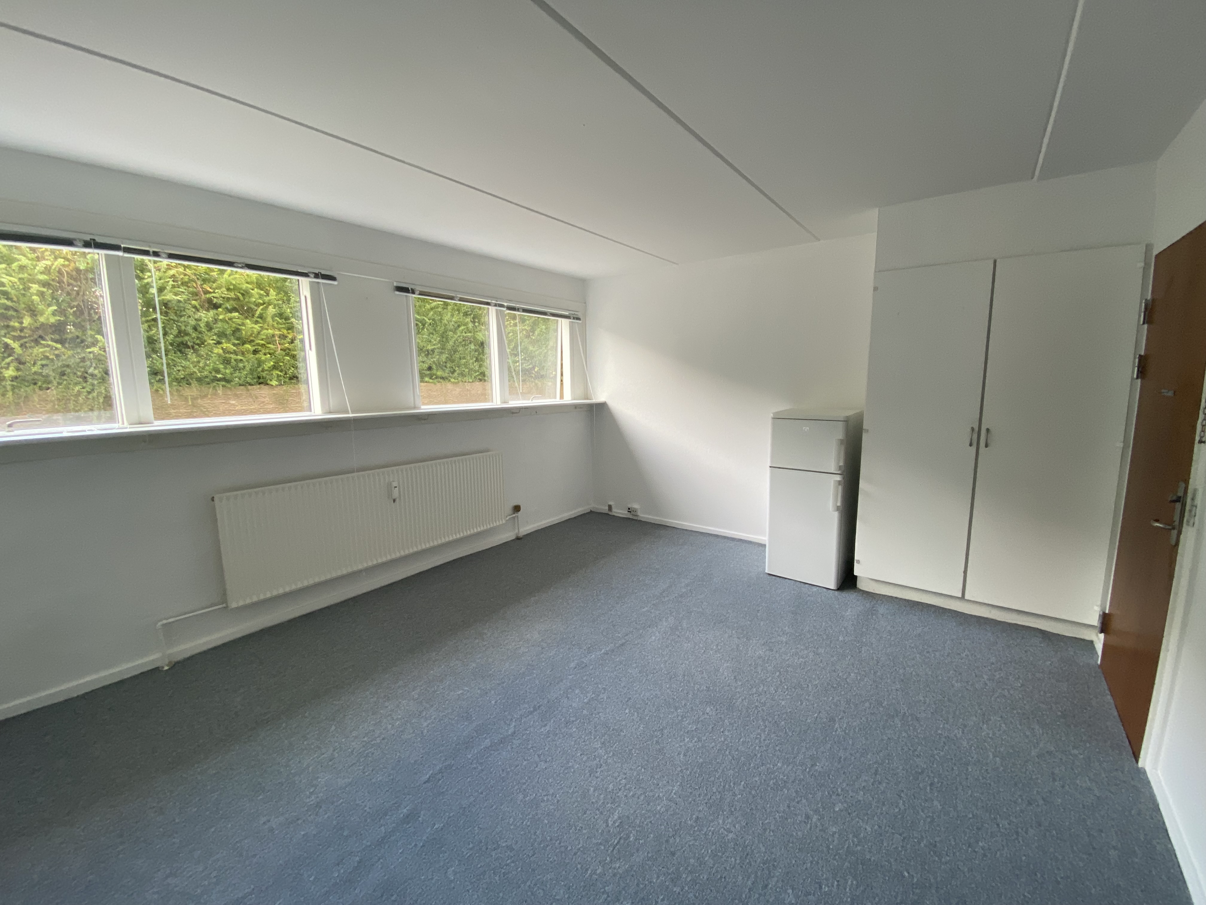 Her får du et skønt lyst værelse med vinduespartier, der vender ud mod områdets grønne område. Værelset, der ligger i stueplan, har nymalede hvide vægge og nyt gulvtæppe. Her er der god plads til både seng og spisebord, og tidligere beboere har også haft eget minikøkken sat op. Der er desuden et indbygget dobbeltskab, og et køle-/fryseskab.