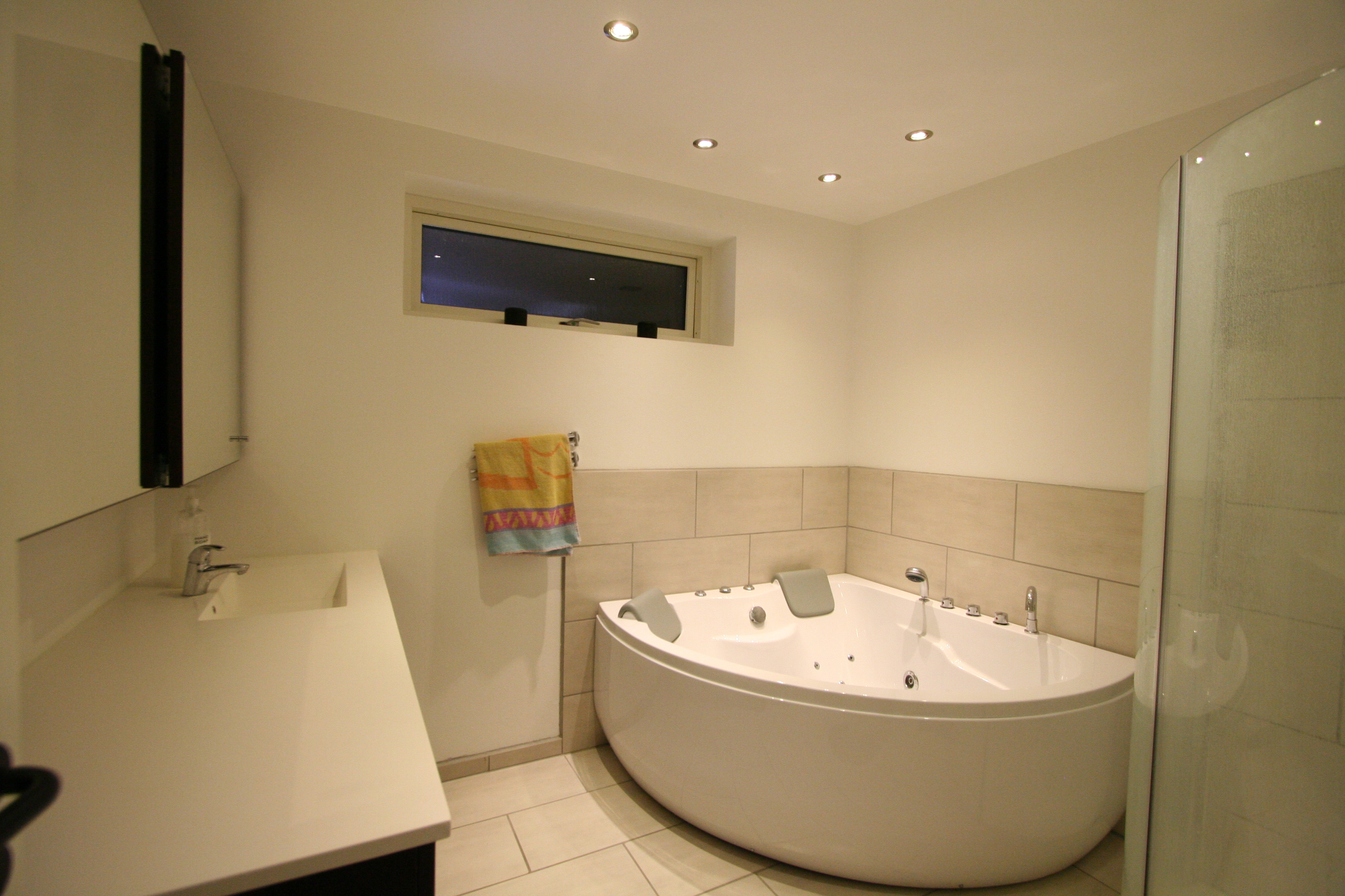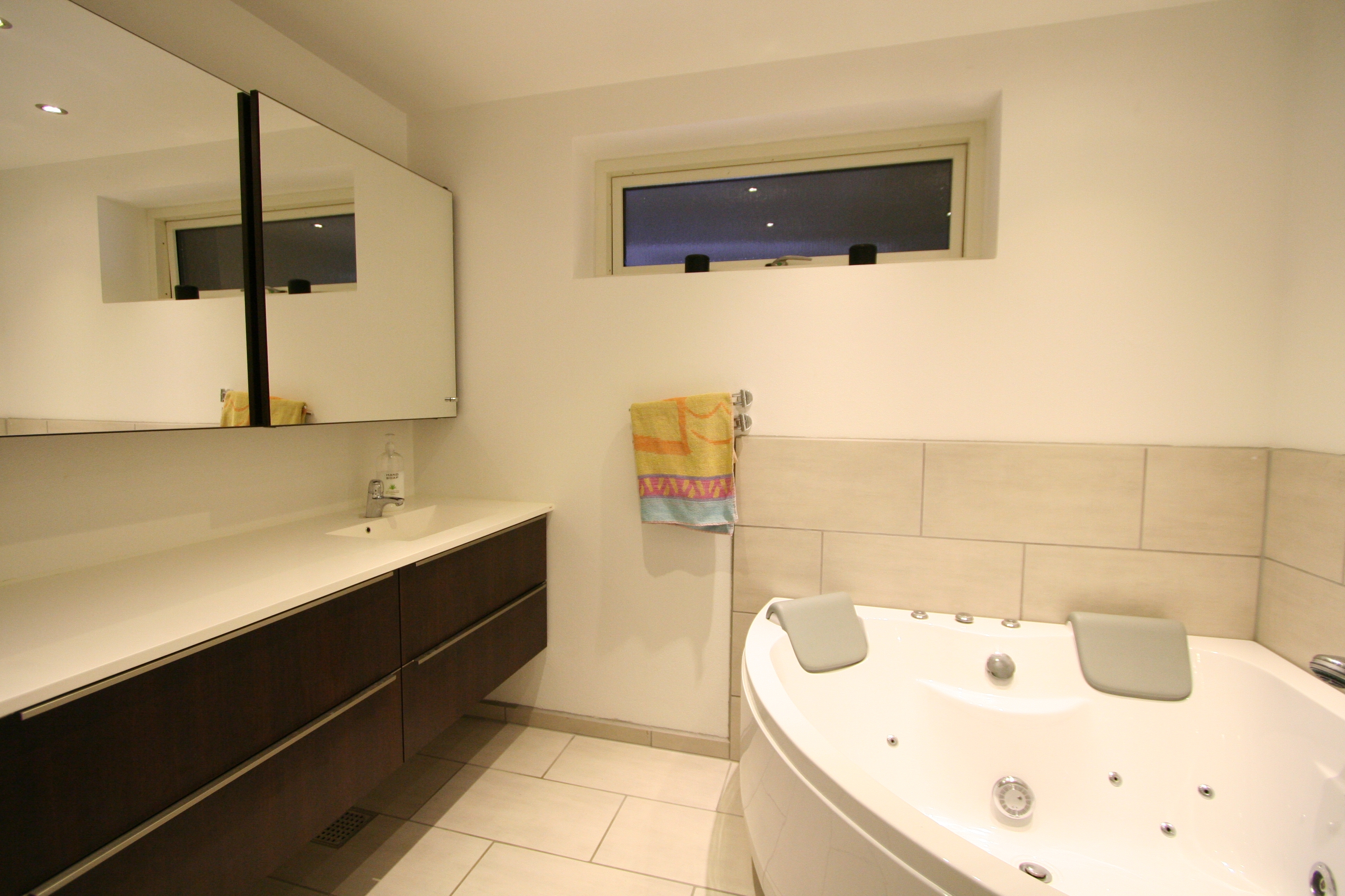 - Stort Badeværelse med bruseniche og med plads til at lejer kan anskaffe sig spa/hjørnebadekar.