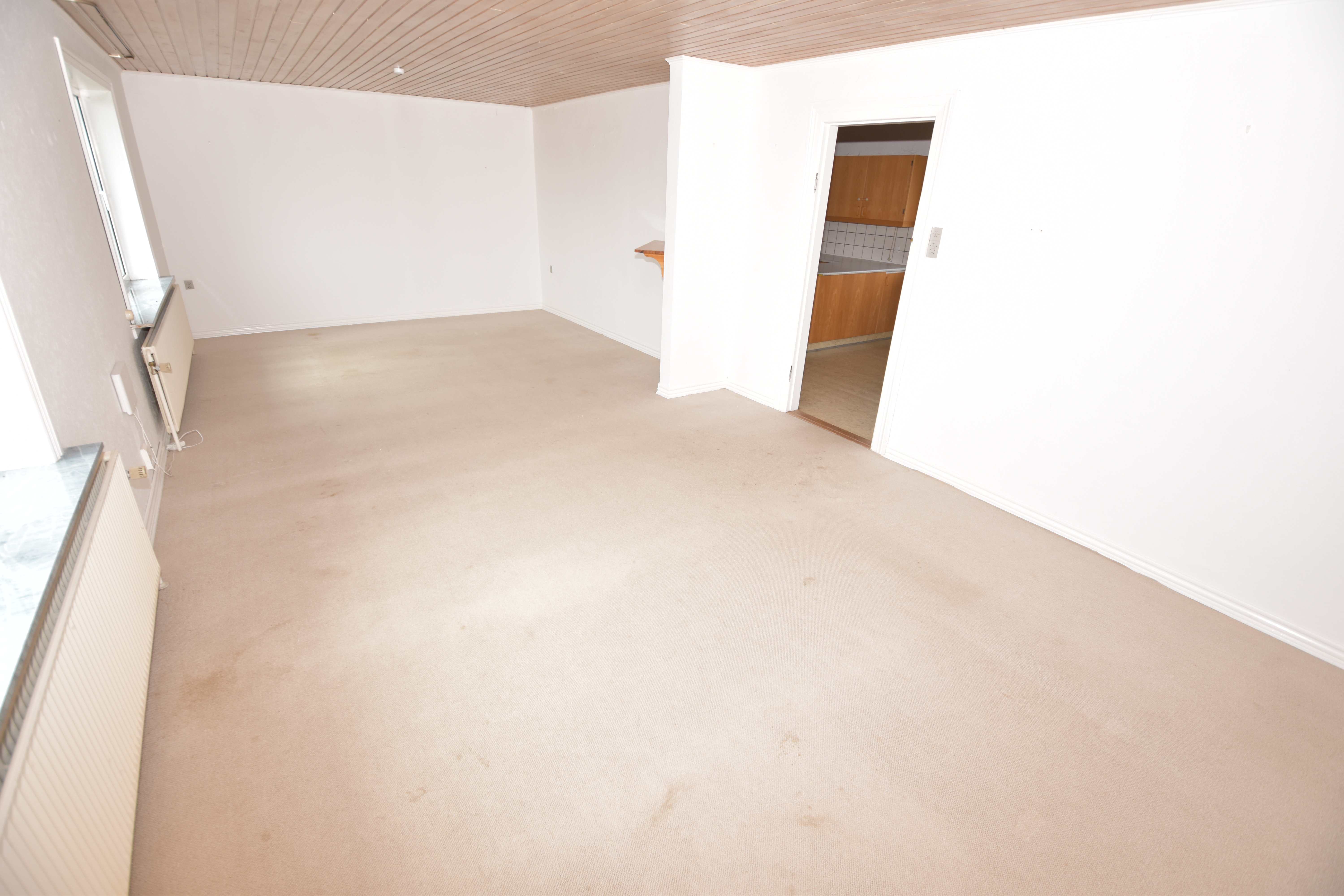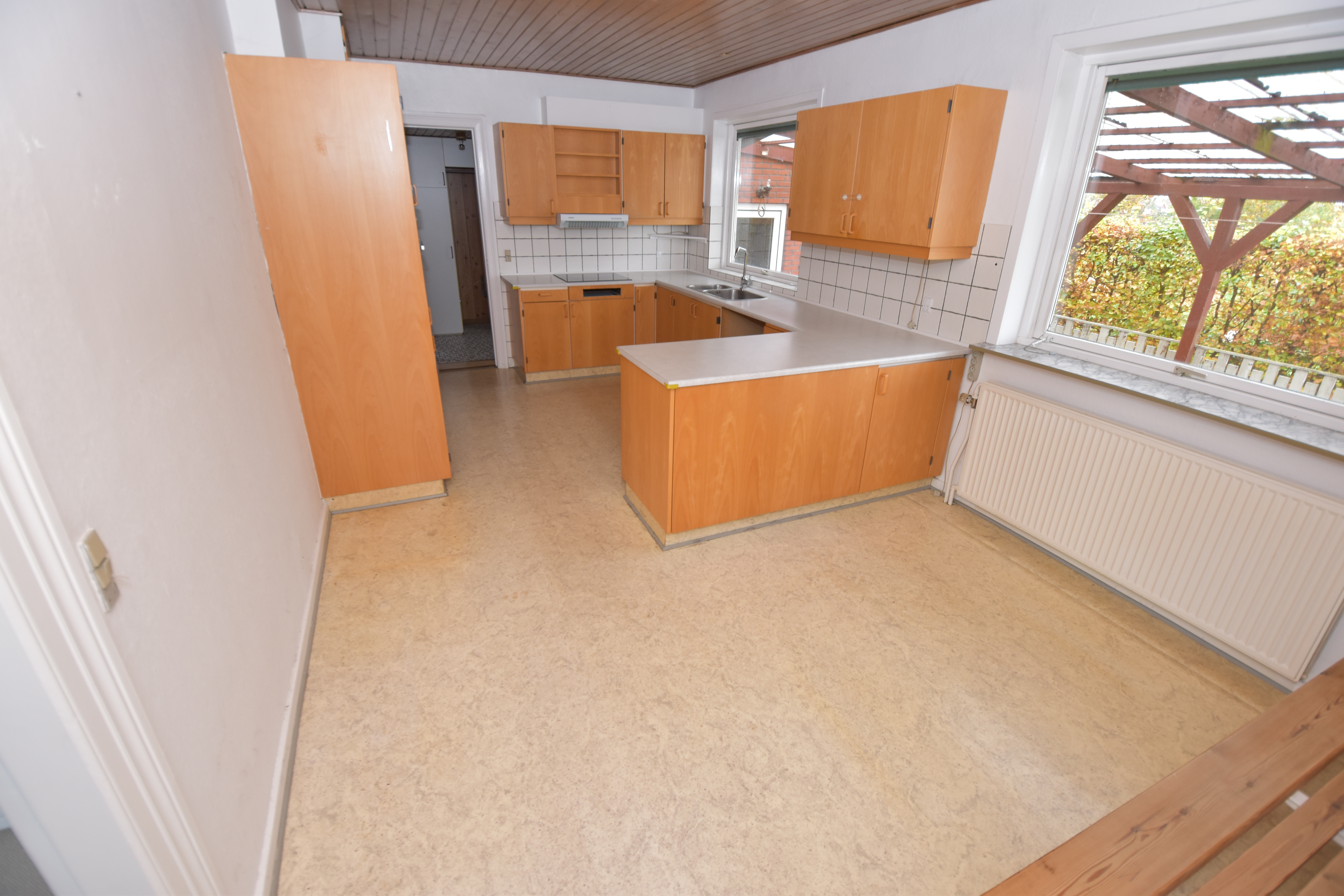 Køkkenet er med spisekrog.Derudover er der i køkkenet plads til en opvaskemaskine Fra køkkenet er der adgang til stuen, som har vinduer mod haven.