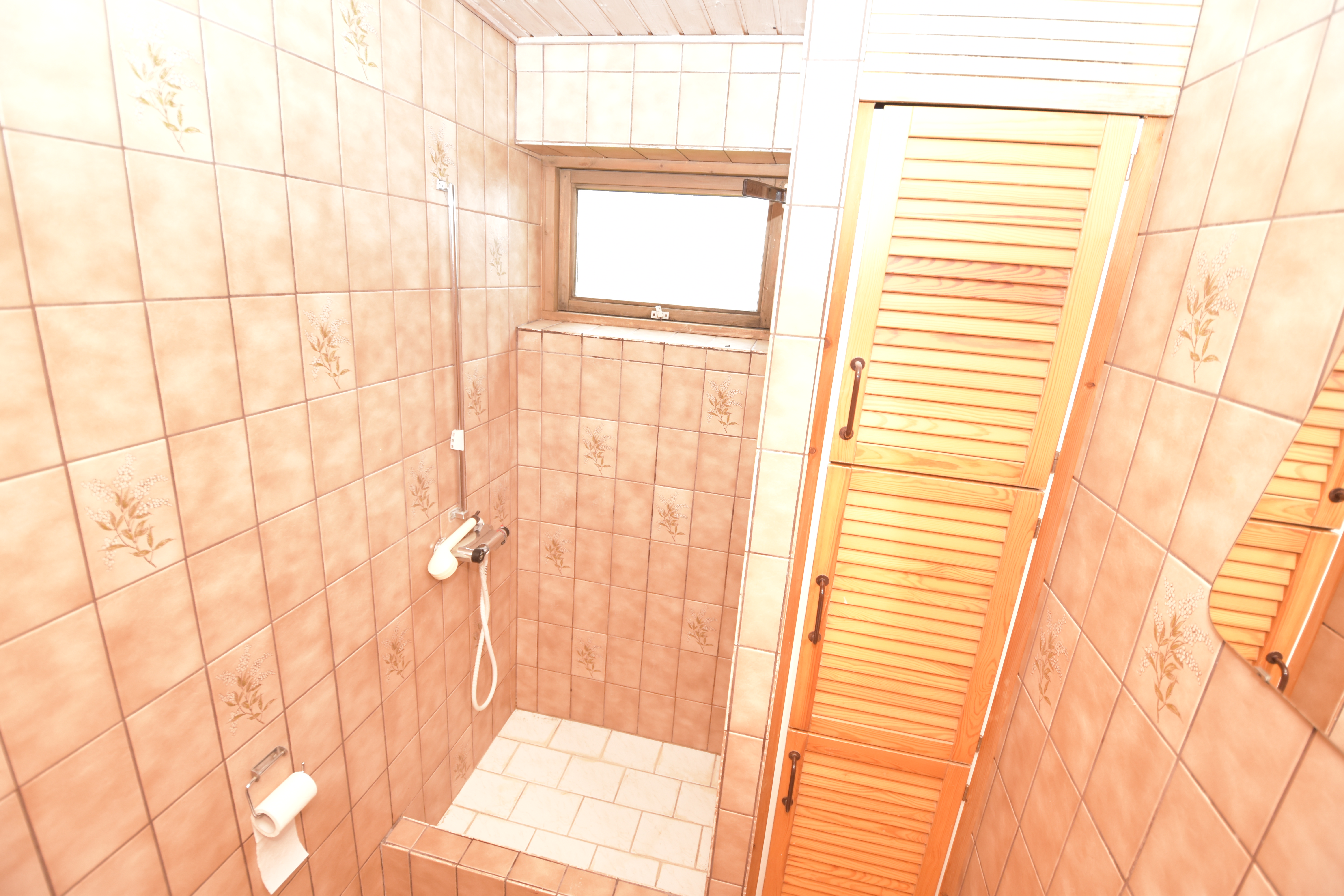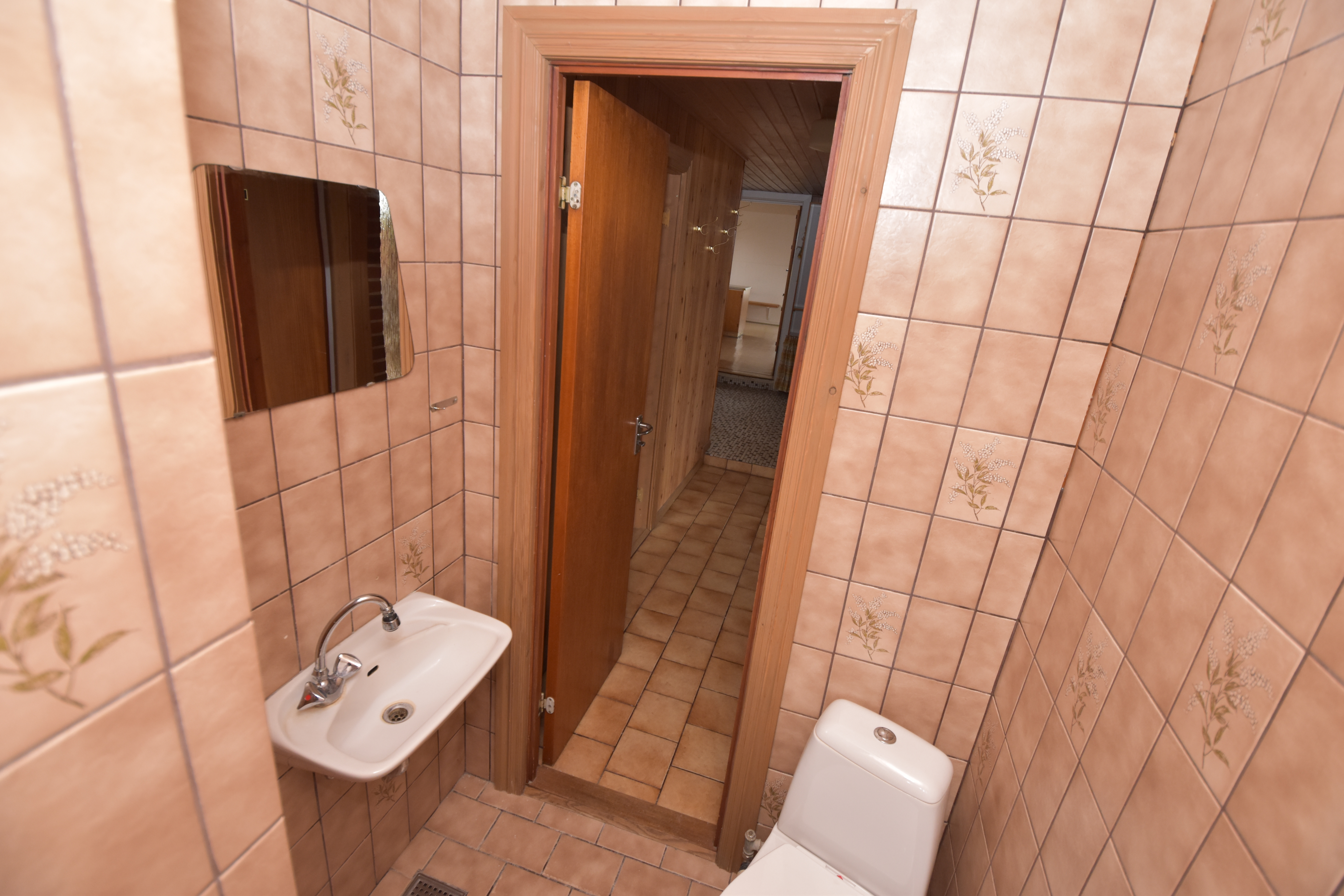 Der er adgang til en flisebelagt udestue. Værelserne er hovedsageligt med gulvtæpper.Der er også bad/toilet i stueplan.Brusenichen består ligesom resten af badeværelset af klinker på både gulv og vægge.